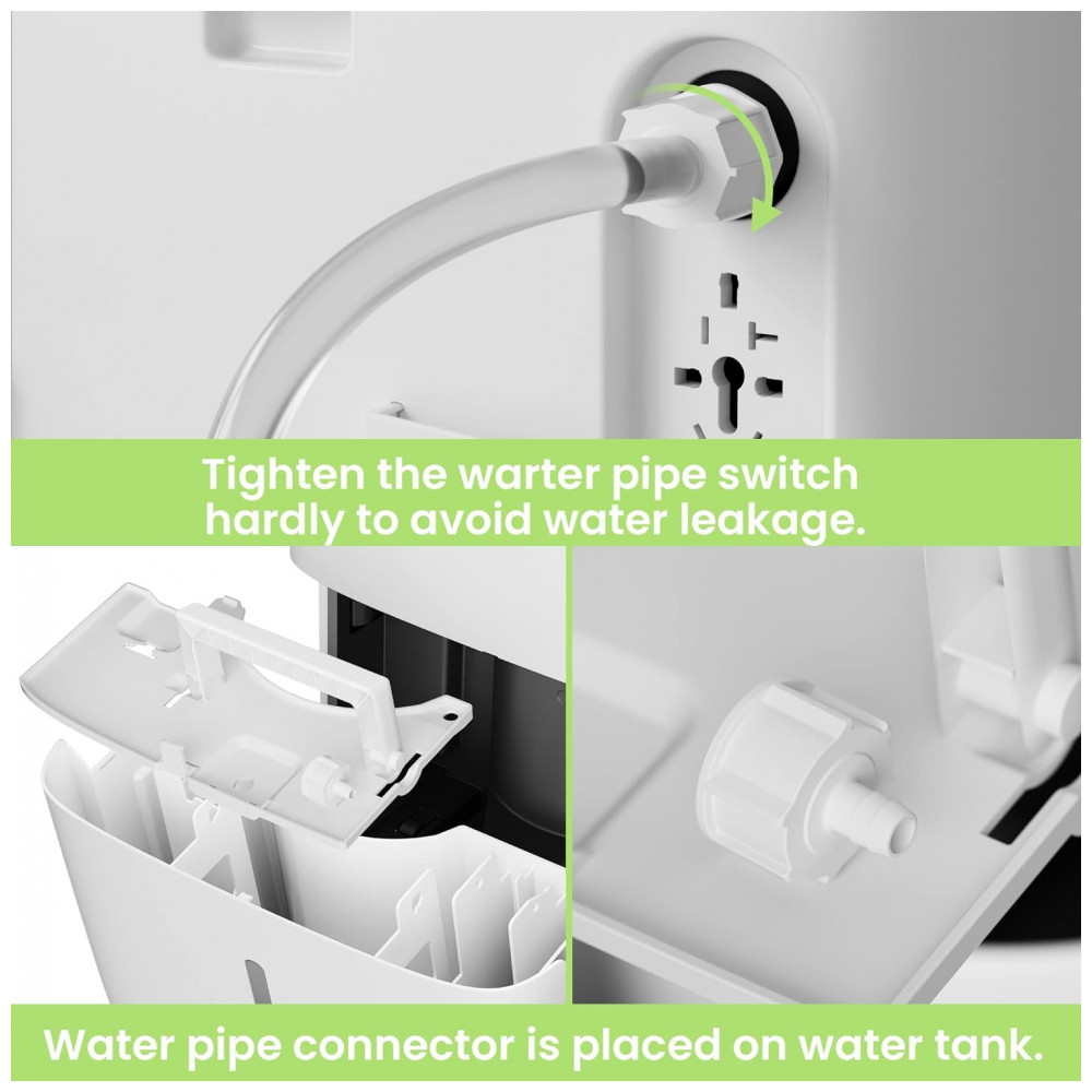 VÁRIAS OPÇÕES DE DRENAGEM Dois métodos de drenagem são fornecidos para você. Você pode destacar e remover o balde para esvaziar o reservatório de 7,5 L 2,04 Gal ou permitir a drenagem contínua apenas por meio de uma mangueira de drenagem incluída para sua tranquilidade. O NÍVEL DE ÁGUA VISÍVEL do tanque permite que você saiba rapidamente a quantidade de água. O filtro DESTACÁVEL permite que você o remova e lave. CUIDADO Ao drenar com o tanque de água, aperte o interruptor no cano de água para evitar vazamento de água .