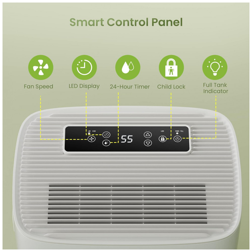 FÁCIL DE OPERAR E BLOQUEIO PARA CRIANÇAS Ao integrar um painel de controle inteligente, o desumidificador permite que você controle a unidade de maneira fácil. O visor de leitura de umidade ajuda a maximizar a conveniência de monitorar a umidade, ajustar o nível de umidade e definir o cronômetro. Basta ajustar a sua umidade ideal, ele detectará de forma inteligente a umidade do ambiente e controlará a desumidificação para manter os níveis de umidade predefinidos. O Bloqueio para crianças ajuda a evitar que as crianças evitem perigos potenciais cas por operação incorreta
