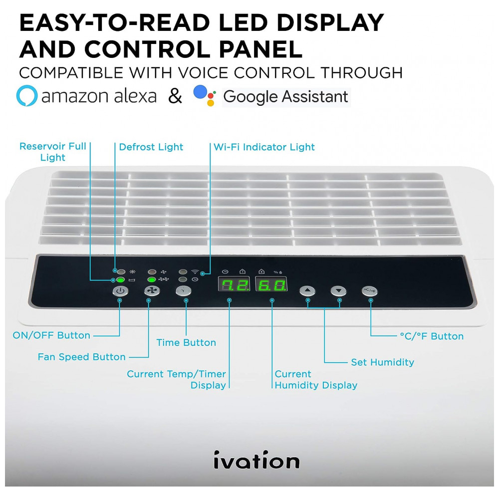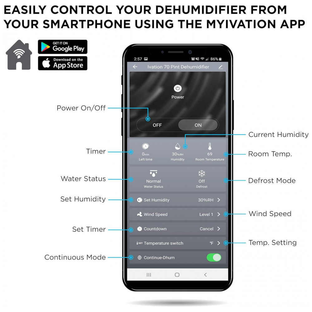 APP DE CONTROLE INOVADOR VIA WI FI Finalmente, você pode monitorar e ajustar os níveis de umidade de longe Use o aplicativo Ivation GRATUITO para ligar, desligar o dispositivo, verificar a temperatura ambiente, umidade e níveis de água, ajustar a velocidade do ventilador, definir um temporizador e muito mais Ótimo para verificar a unidade no trabalho, nas férias ou em outro quarto