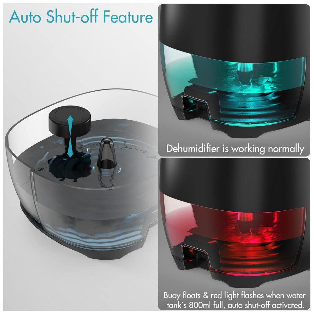 3 O desumidificador de banheiro é equipado com um tanque de água de 35 onças 1000 ml, ele será desligado automaticamente quando o tanque de água estiver cheio de 27 onças 800 ml de água. A bóia interna flutua e a luz vermelha pisca para lembrar, segura para usar no banheiro mesmo se você não estiver em casa.