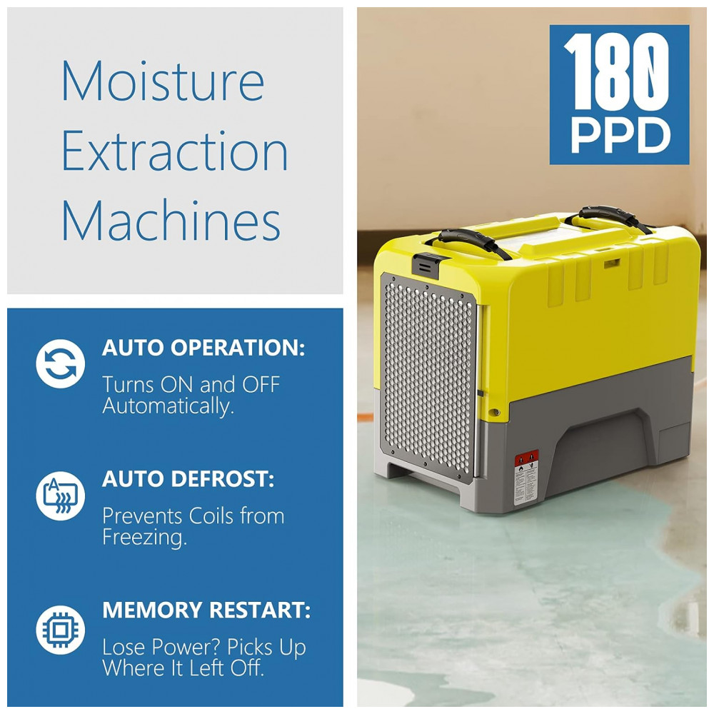 Este desumidificador com alto fluxo de ar de 210 CFM para maximizar o desempenho de secagem, é capaz de remover até 180 litros de água do ar por dia na saturação 32,22C, 90 e 85 PPD AHAM, uma escolha superior para a indústria de secagem e restauração de danos cas pela água em grande espaço de até 213,68 metros quadrados.