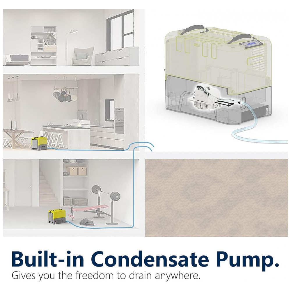 Este desumidificador com bomba irá drenar automaticamente o condensado para a operação de baixa manutenção. Além disso, a mangueira de drenagem de 5,97 metros de comprimento e a altura vertical de drenagem de 4,47 metros maximizam a flexibilidade da instalação.