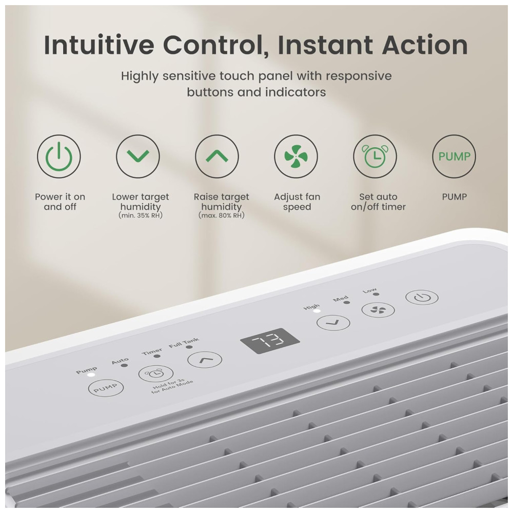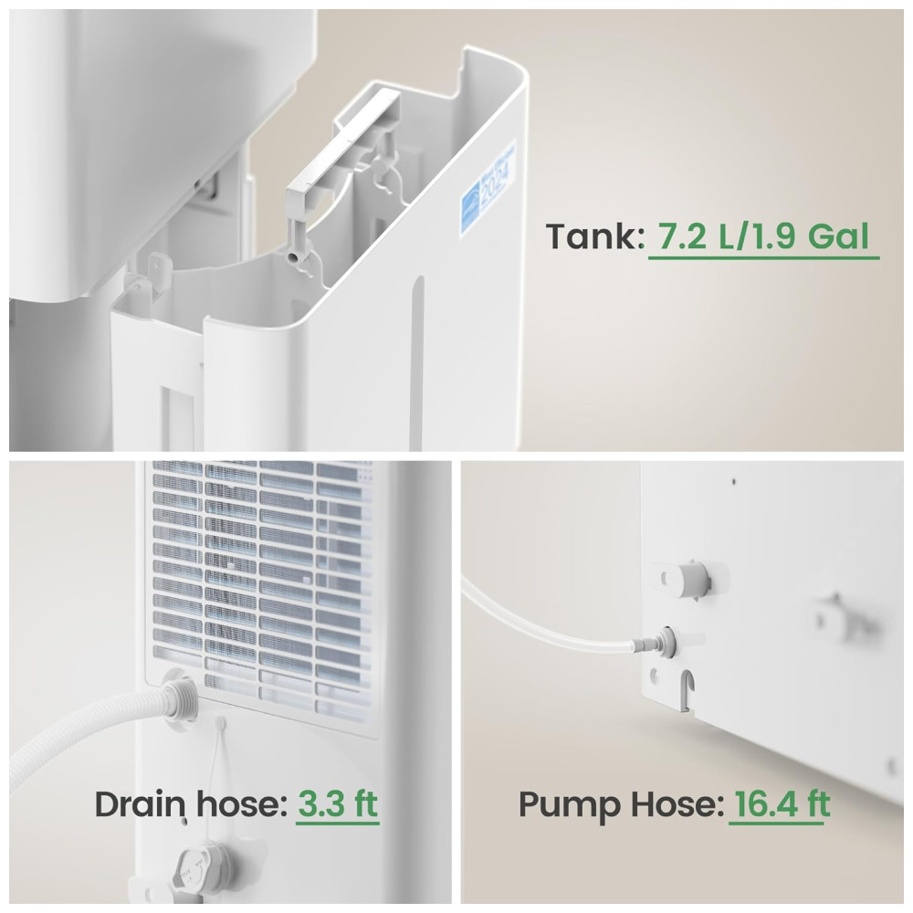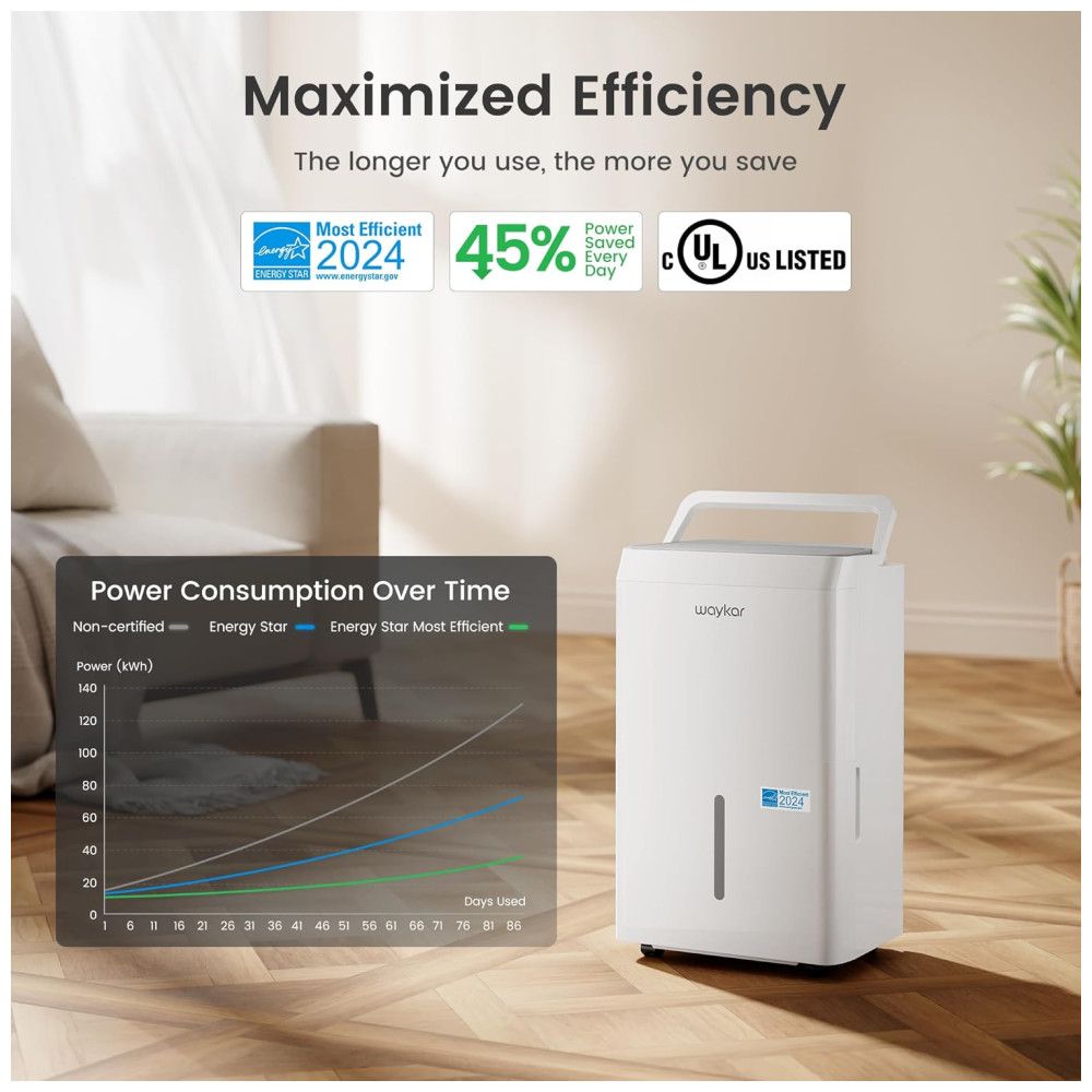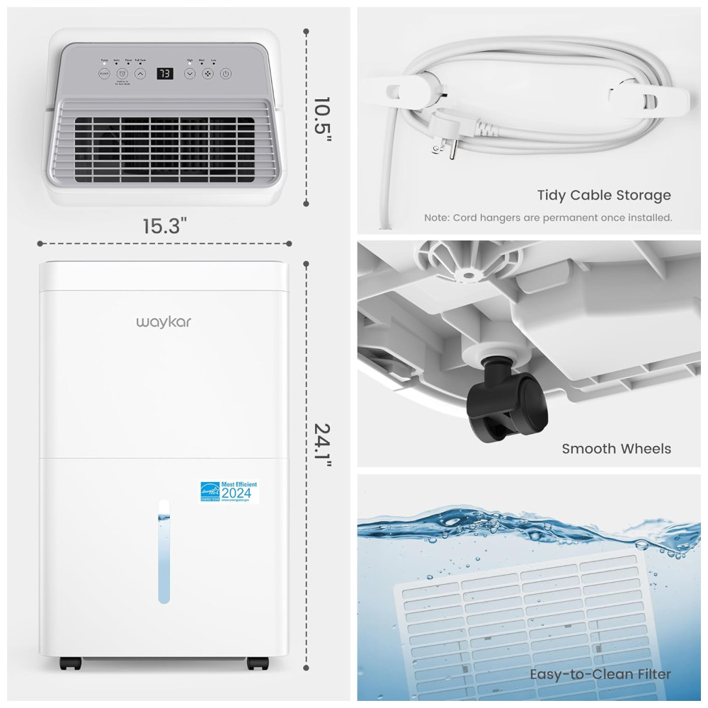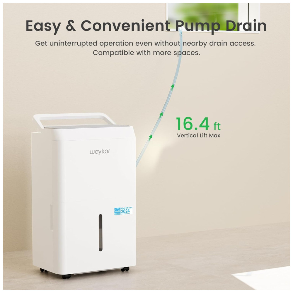 O desumidificador portátil Waykar com bomba pode remover até 70,97 litros de umidade por dia, sendo ideal para espaços de até 666 metros quadrados. Com capacidade máxima de 70,97 litros sob condições de 35°C e 90% de umidade relativa, é perfeito para residências, porões, salas de estar, banheiros, lavanderias, escritórios, espaços comerciais, áreas industriais e ambientes comerciais menores como cafeterias, academias e oficinas. Possui bomba embutida com mangueira de drenagem de 5 metros para escoamento eficiente. Além disso, conta com filtro lavável de grau de ar condicionado, modo de conforto automático, baixo nível de ruído, proteção contra sobrecarga, proteção contra transbordamento, timer de 24 horas e organizador de cabo para uma experiência tranquila e sem preocupações. A eficiência sustentável e a gestão de cabos sem emaranhados garantem uma vida útil mais longa e prática.