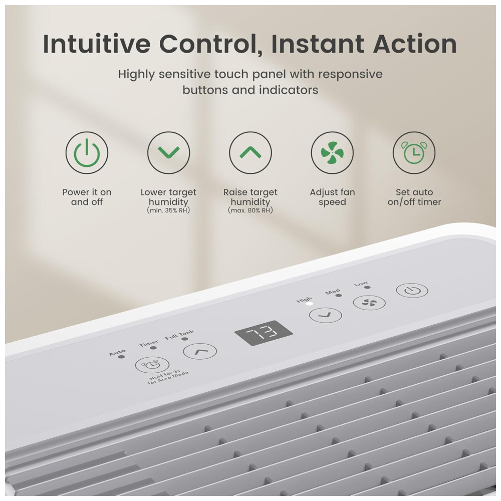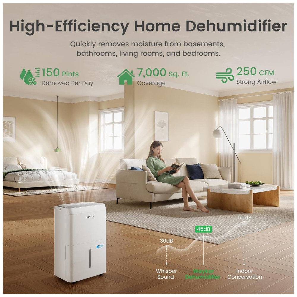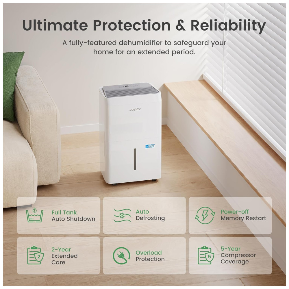 O desumidificador portátil Waykar é uma solução eficiente para remover até 70,97 litros de umidade por dia, ideal para áreas de até 666 metros quadrados. Com design prático, rodas e alças para fácil mobilidade, é perfeito para residências, porões, salas de estar, banheiros, lavanderias, escritórios, espaços comerciais, áreas industriais e locais comerciais como cafeterias, academias e oficinas. Com classificação Energy Star Most Efficient, reduz o consumo de energia em 45%, possui filtro lavável de qualidade de ar condicionado que evita a entrada de pelos e pelos de animais, ajudando a reduzir a conta de eletricidade. Seu modo automático ajusta a umidade de acordo com a temperatura ambiente, oferece 3 velocidades de ventilação ajustáveis e níveis de ruído abaixo de 40 dB. Recursos como descongelamento automático, proteção contra sobrecarga, memória de falta de energia, proteção contra transbordamento, timer de 24 horas e proteção automática do compressor prolongam a vida útil do desumidificador. Possui tanque visual de 7,1 litros com desligamento automático quando cheio e mangueira de drenagem de 1 metro para facilitar o esvaziamento. A eficiência sustentável é garantida pelo filtro lavável e pelo gerenciamento de cabos sem emaranhados.