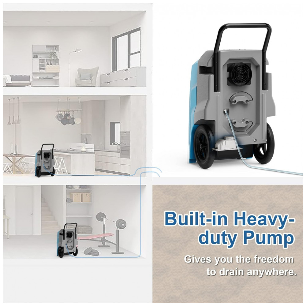 Apresentando uma bomba interna de condensado resistente de 4,48 metros de altura de drenagem conectada a uma mangueira de drenagem de 5,97 metros de contrato incluída, o que facilita a drenagem automática da condensação em qualquer lugar. Este desumidificadorpossui reinicialização automática após as quedas de energia, degelo automático, degelo automático, drenagem contínua bomba embutida para controle de umidade sem esforço.