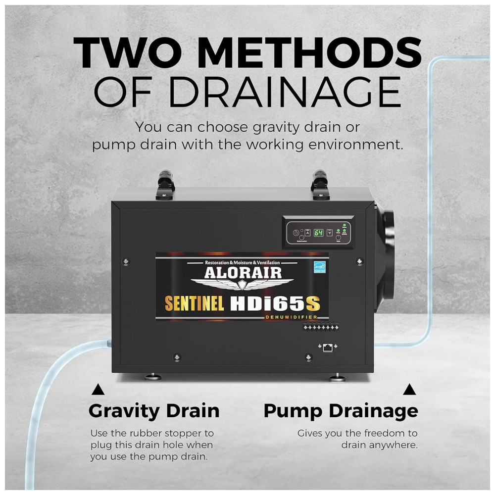 Uso super conveniente: Pode escolher o dreno por gravidade ou o dreno da bomba com o ambiente de trabalho. Uma bomba de condensado integrada: ao remover grandes quantidades de umidade, com uma distância de elevação de 19,6 metros, a bomba de condensado oferece a liberdade de drenar em qualquer lugar. A bomba de condensado mantém o desumidificador funcionando de maneira suave e eficiente, empurrando continuamente a água coletada para fora da área. Dreno por gravidade: usando a conexão da mangueira de drenagem do desumidificador para esvaziar a água no ralo do chão.