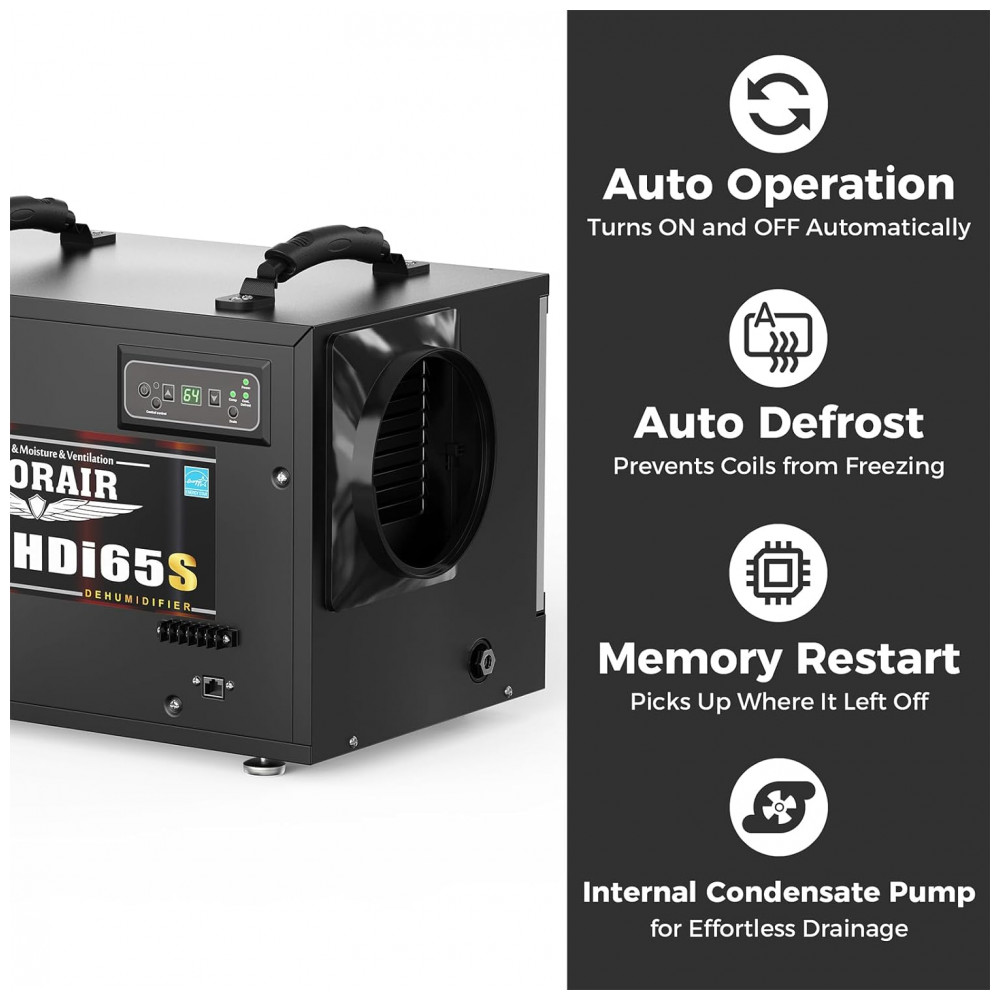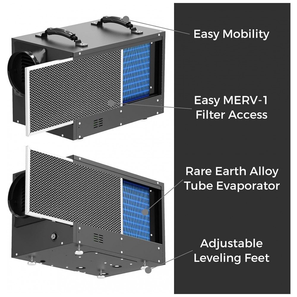 Projetado para a casa moderna: Para sua satisfação, projetamos este desumidificador profissional pensando no consumidor moderno. Todos os recursos especiais o tornam o melhor para aplicações em crawlspace, porões e comerciais, sistema de degelo automático, sistema de controle remoto opcional, filtro MERV 1, operação em baixa temperatura, listado no cETL.