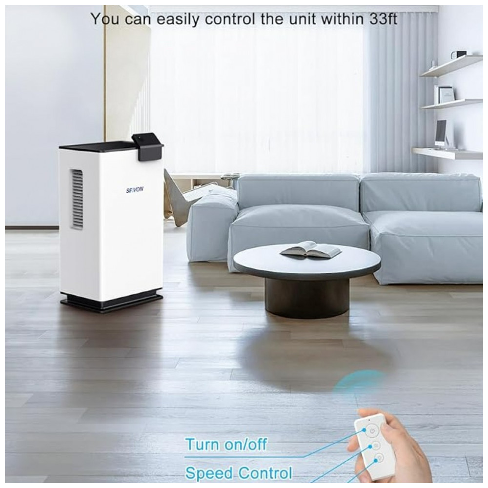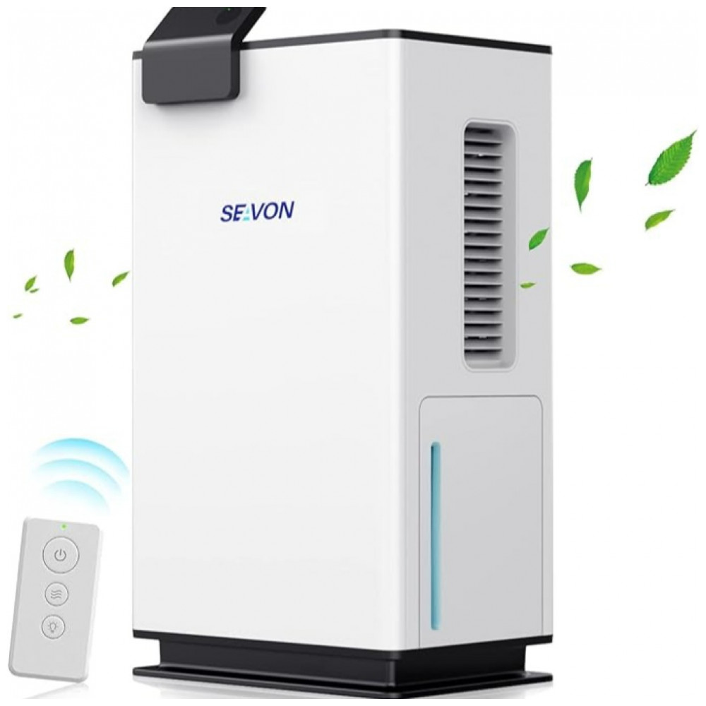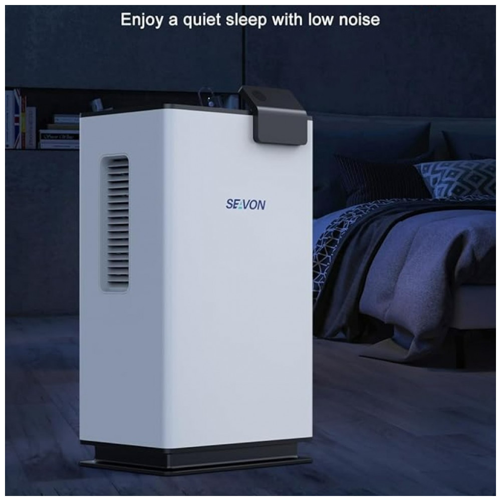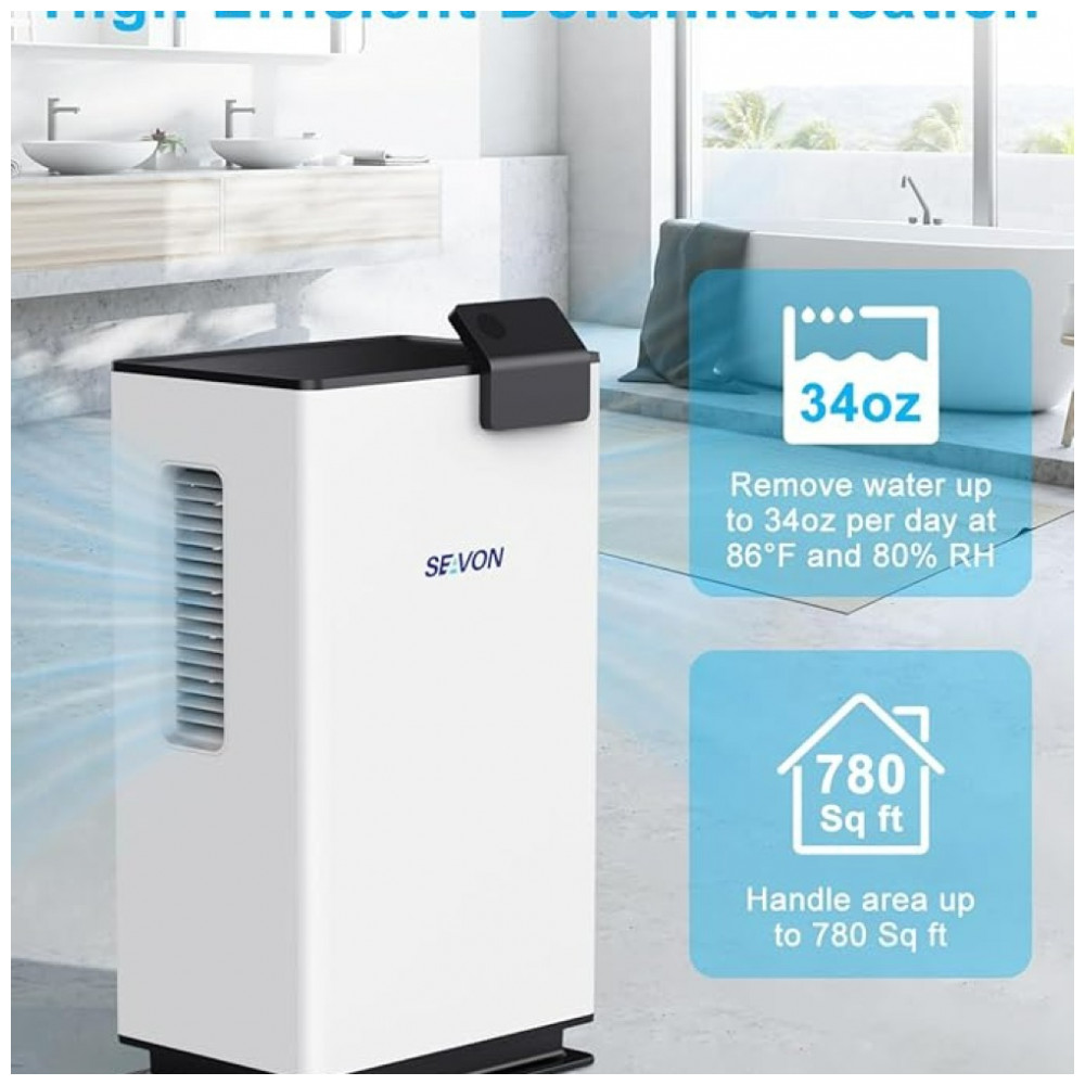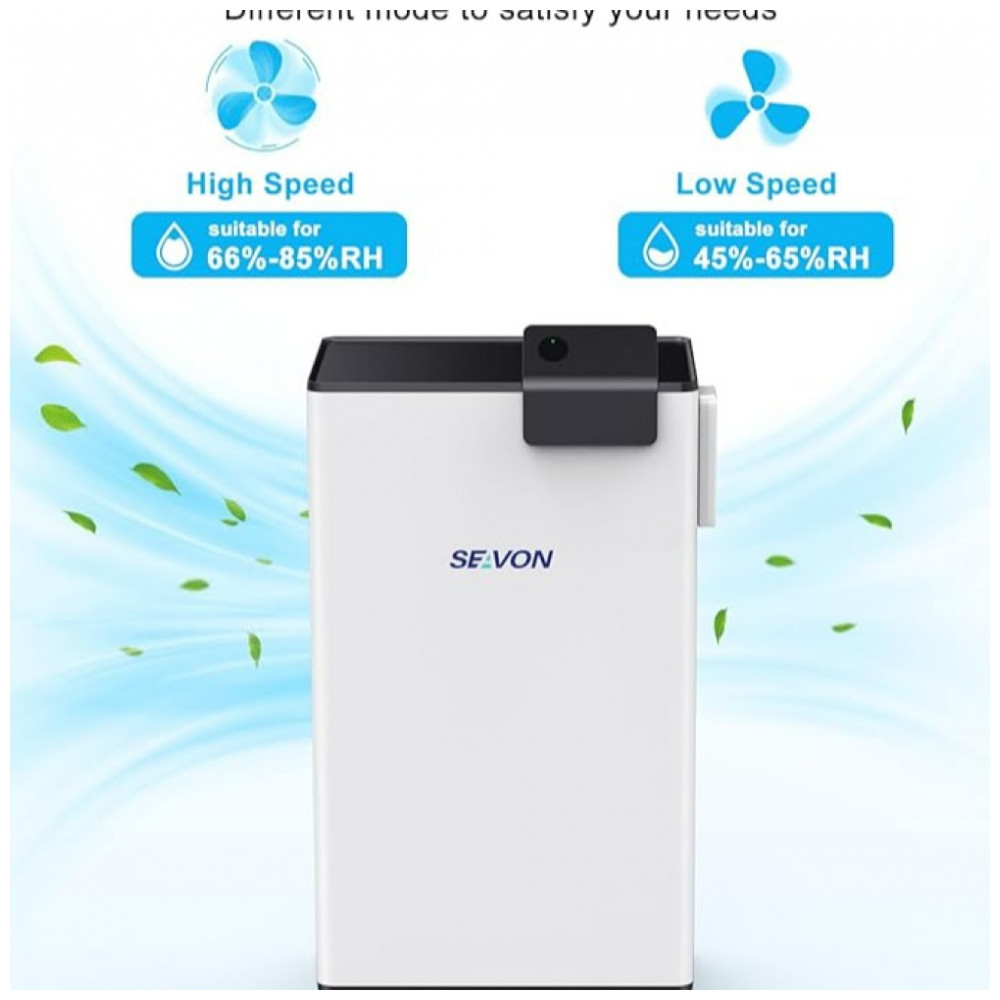 ALTA EFICIÊNCIA O desumidificador SEAVON foi aprimorado com um tanque de água de 2,4 gramas e uma taxa de desumidificação altamente eficiente de 1,2 gramas, quando em condições úmidas de 86F e 80 RH