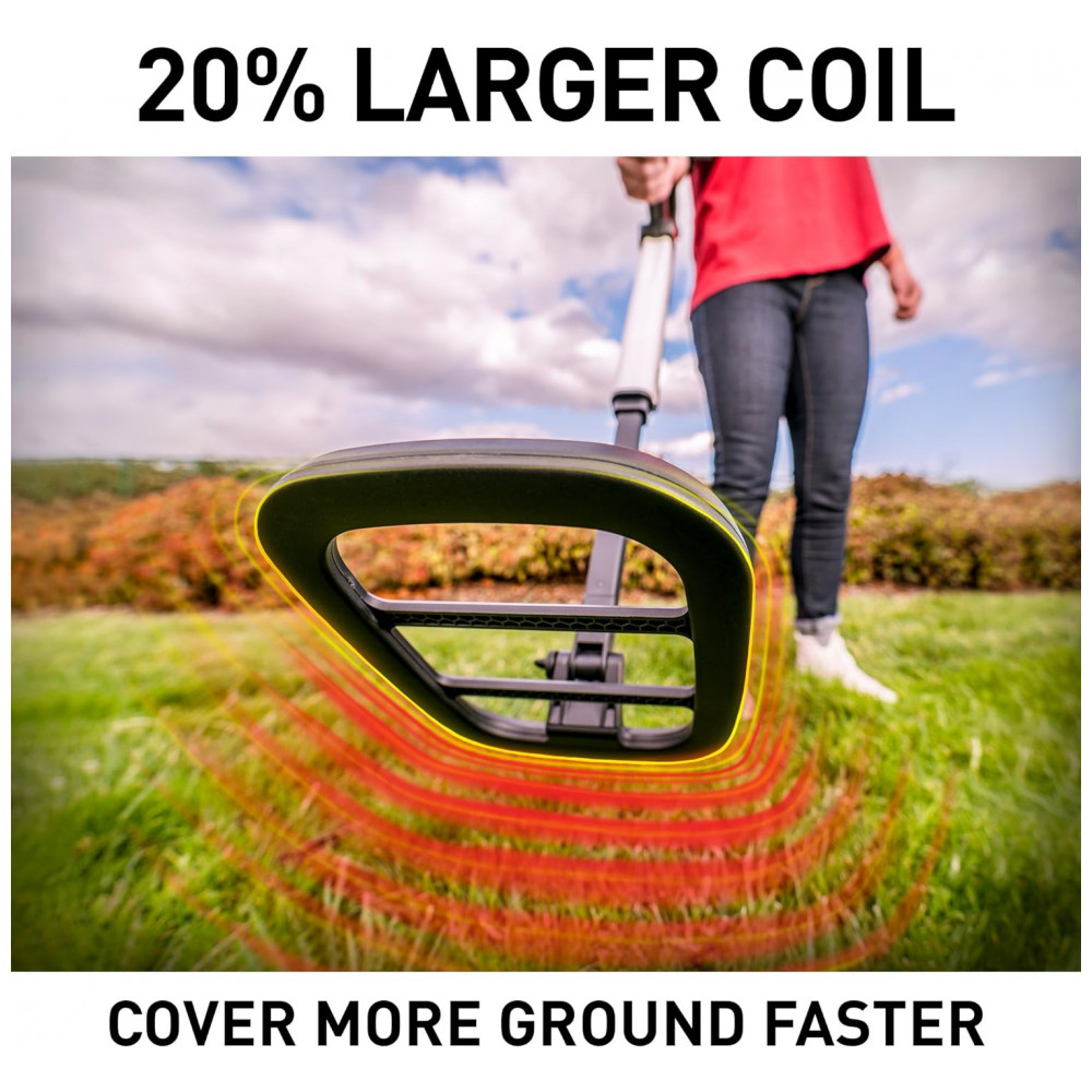 ÓTIMO PARA VIAGENS Portátil mas poderoso A bobina grande, impermeável, de 25,4 centímetros é leve, e o design dobrável facilita o transporte. Use o em seu quintal, traga o para a praia ou qualquer um dos seus locais favoritos de caça ao tesouro