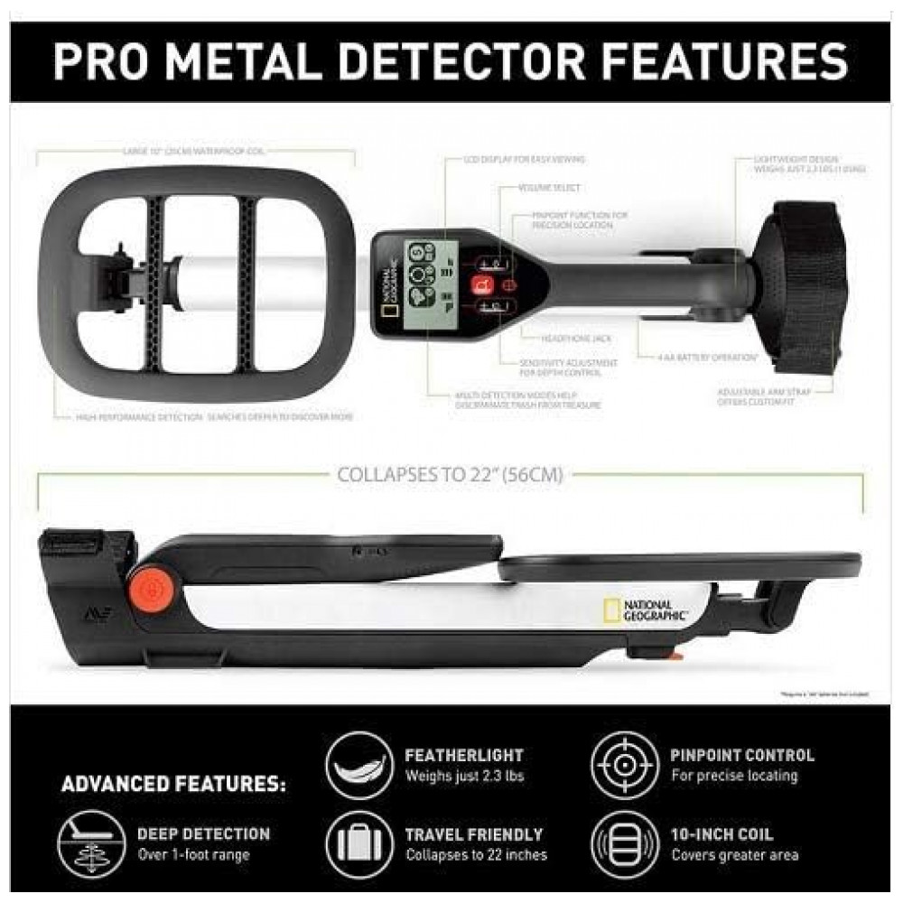 Detector de Metais com Pinpointer Bobina Grande à Prova dÁgua Leve e Dobrável National Geographic