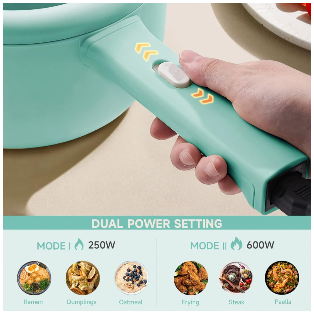 Com potência ajustável entre 250W e 600W, esta panela aquece rapidamente, preservando o sabor e a textura dos seus pratos favoritos. Seus mecanismos de proteção contra superaquecimento e funcionamento a seco garantem segurança total durante o uso. Compacta, com capacidade total de 2 litros, mede aproximadamente 41,9 cm de diâmetro por 20,3 cm de largura e 14 cm de altura, facilitando o armazenamento em espaços pequenos, perfeita para quem vive em dormitórios ou ambientes sem fogão.