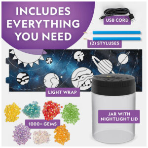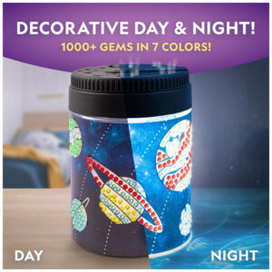 Com o Diamond Painting Night Light Sistema Solar da National Geographic, crianças vivem uma experiência completa de arte engenharia e descoberta: enquanto montam um painel personalizado com mais de 1.000 gemas coloridas, elas também criam sua própria luminária noturna temática do espaço. O kit une a arte do “diamond painting” à funcionalidade de luz LED multicolor — ao final, o projeto vira luminária decorativa para o quarto. O painel mostra o sistema solar com planetas, estrelas e detalhes que brilham tanto de dia quanto à noite, incentivando curiosidade pelo universo, habilidades manuais, coordenação olho‑mão e noções iniciais de design e ciência.
