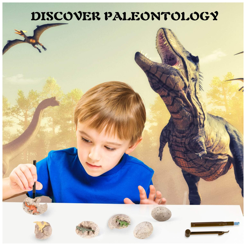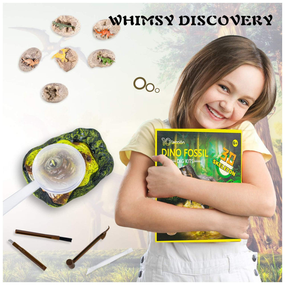 3 TIPOS DE DIVERSÃO DIFERENTE DE ESCAVAÇÃO 1. Fósseis de cabeça de dinossauro a criança pode escavar 5 fósseis de dinossauros reais, incluindo 2 dentes de tiranossauro, 1 garra de tiranossauro e 2 pedras de lava 2. Os ossos de dinossauro dentro do Brick podem montar o esqueleto 3D do T rex. 3. 6 peças Dino Eggs Dig Kit e descubra 6 designs únicos de dinossauros. Sinta se como um verdadeiro paleontólogo escavando dinossauros de brinquedo exclusivos de 3 estilos de escavação.