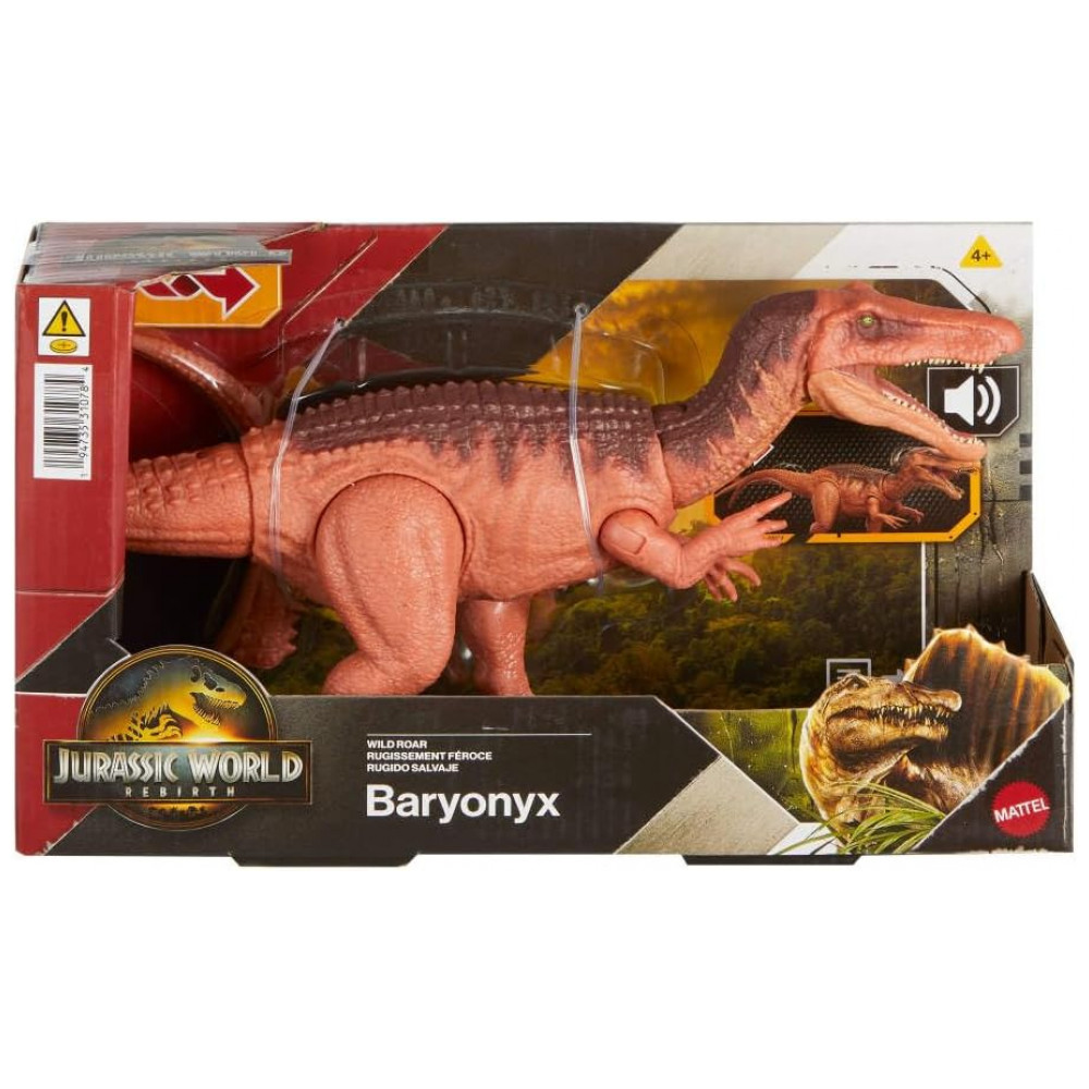 O Mattel Jurassic World Rebirth Wild Roar Baryonyx é uma figura de dinossauro articulada de porte médio, com cerca de 33 cm de comprimento e 12,7 cm de altura, inspirada em Jurassic World Rebirth. O brinquedo traz a função “Total Attack”: ao mover a cauda para cima e para baixo, a cabeça realiza um ataque com mordida acompanhado de rugido; ao girar a cauda, a direção do ataque muda, criando diferentes situações de batalha.