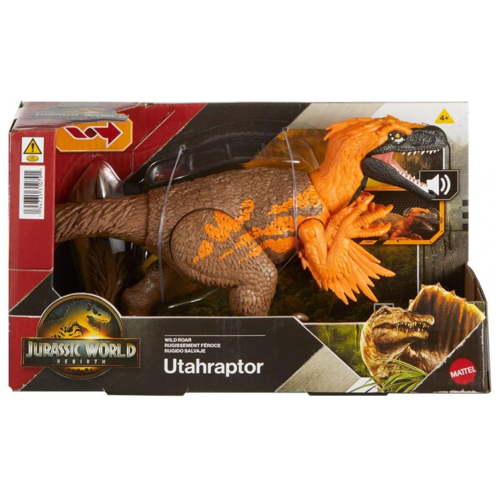O Mattel Jurassic World Rebirth Wild Roar Utahraptor é uma figura de dinossauro de porte médio com cerca de 30,7 cm de comprimento e 12,7 cm de altura, inspirada em Jurassic World Rebirth. O brinquedo traz função “Total Attack”: ao mover a cauda para cima e para baixo, a cabeça executa um ataque com mordida acompanhado de rugido; ao girar a cauda lateralmente, o sentido do ataque muda para brincadeiras de batalha.