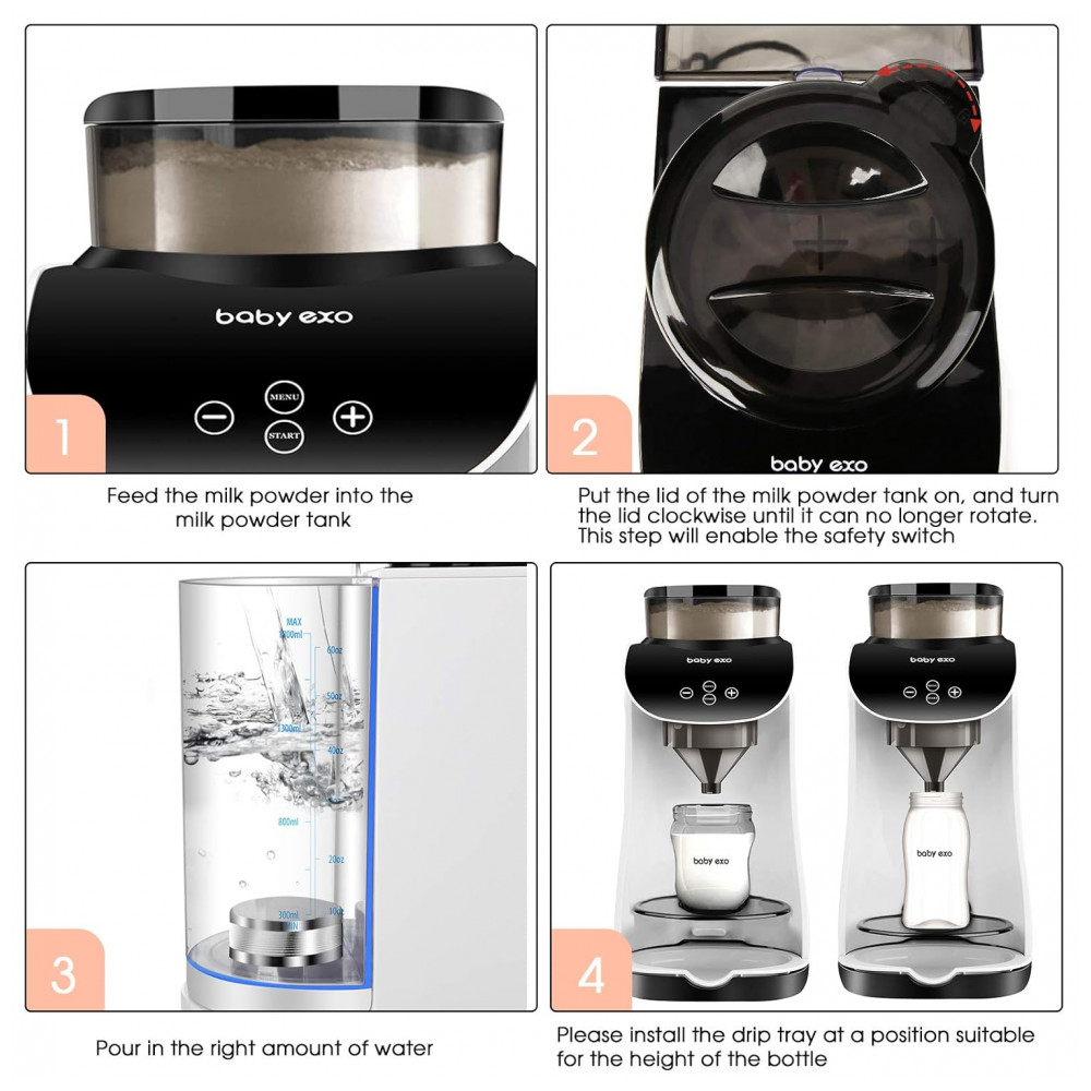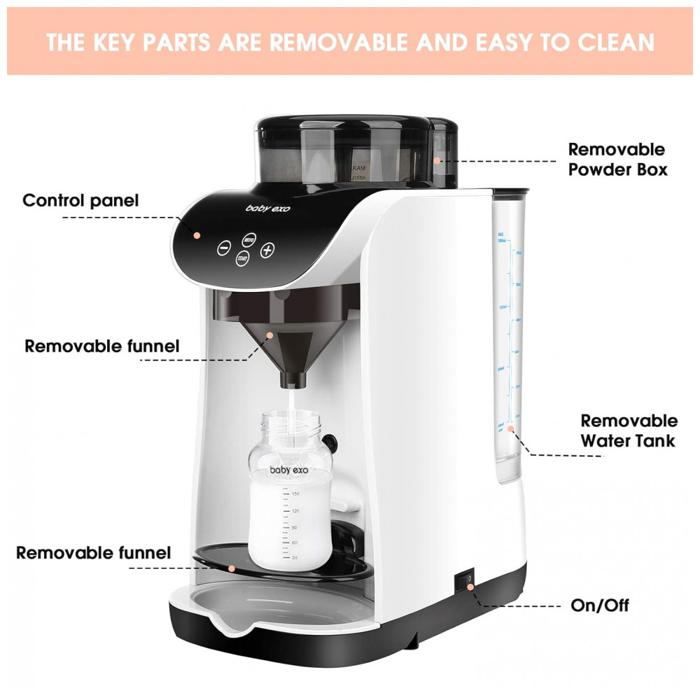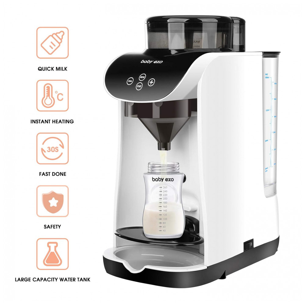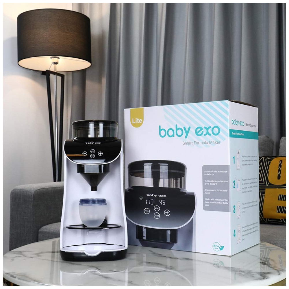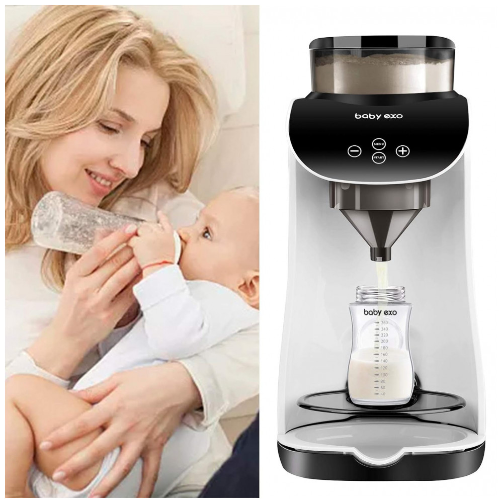 O Dispenser Automático Fórmula BabyEXO é um aparelho elétrico para preparo de mamadeiras com tecnologia de mistura inteligente de leite em pó e água em 10 segundos, sem formação de bolhas de ar. Compatível com diversas marcas de fórmulas e tamanhos de mamadeiras, permite ajuste completo de temperatura (30°C a 70°C) e volume de água (30 ml a 237 ml).