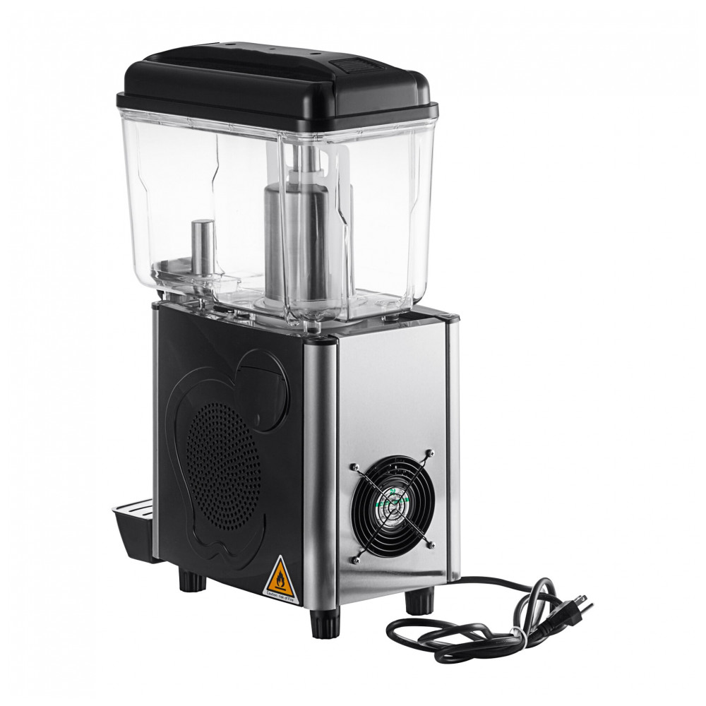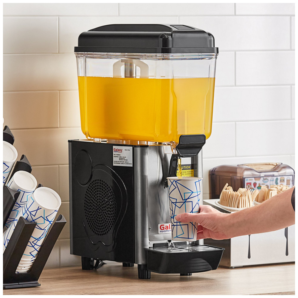 O dispenser de bebidas refrigerado de tigela única Galaxy é projetado para manter bebidas frias como chá gelado, limonada e sucos em restaurantes ou serviços de catering. Com capacidade de 11,4 L por tigela em policarbonato transparente e resistente, inclui marcações de volume para monitoramento fácil dos níveis de líquido.