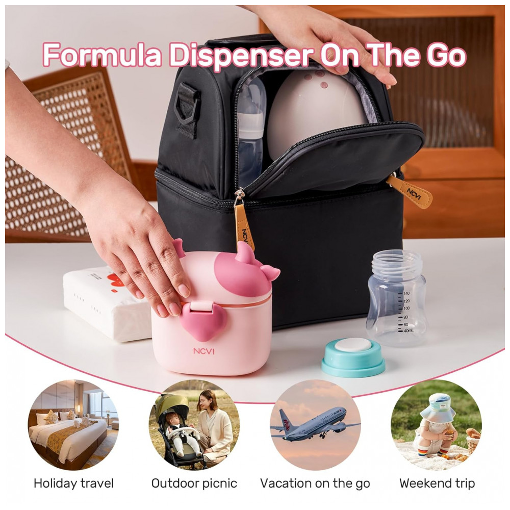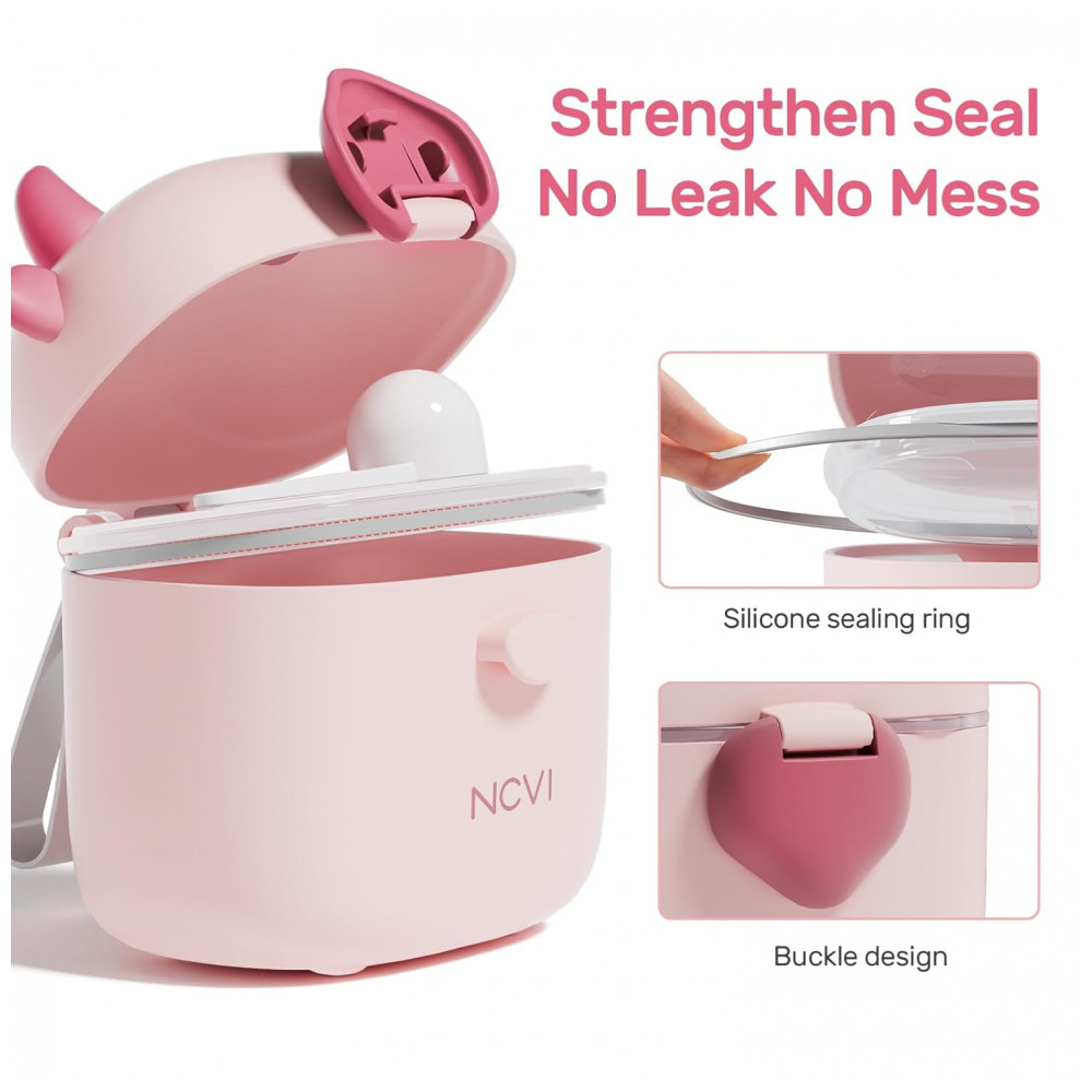 O Dispenser de Fórmula NCVI é um recipiente portátil para armazenamento de leite em pó infantil, lanches, doces ou frutas, com múltiplos compartimentos internos e colher dosadora separada, ideal para viagens, piqueniques ou uso externo com bebês. Possui chifres macios em TPE na tampa para estabilidade durante o preenchimento, com dimensões de 11 cm de comprimento, 8 cm de largura e 12,9 cm de altura.