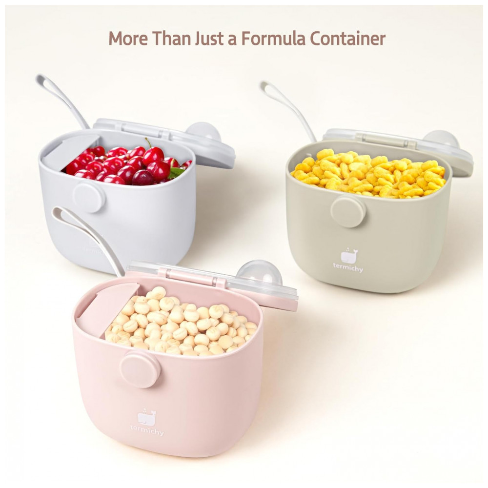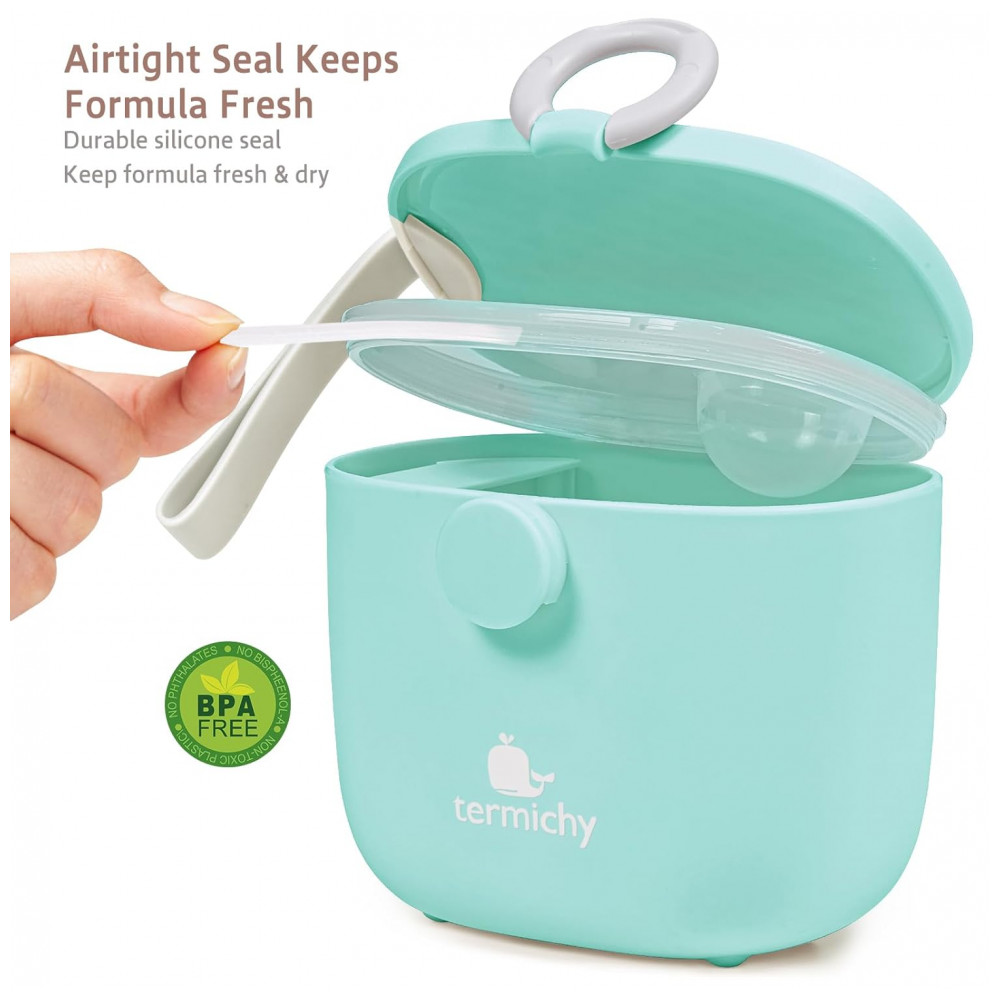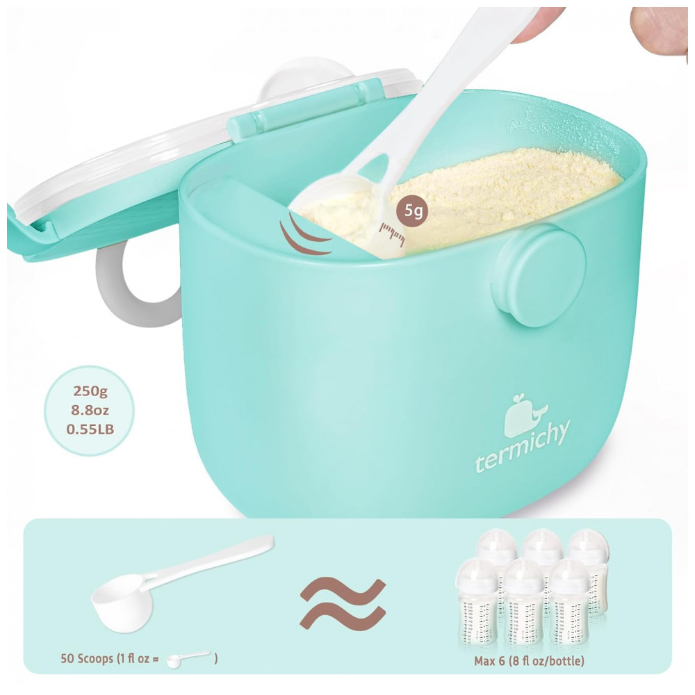 O Dispenser Fórmula Bebê Termichy é um recipiente portátil para armazenar e dosar leite em pó ou lanches para bebês durante viagens ou atividades ao ar livre. Fabricado em PP plástico grau alimentício sem BPA, lavável em lava-louças, possui capacidade de 250g ou 500ml, alça para transporte e design com compartimento separado para colher visando higiene.