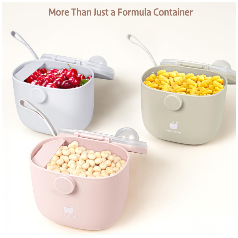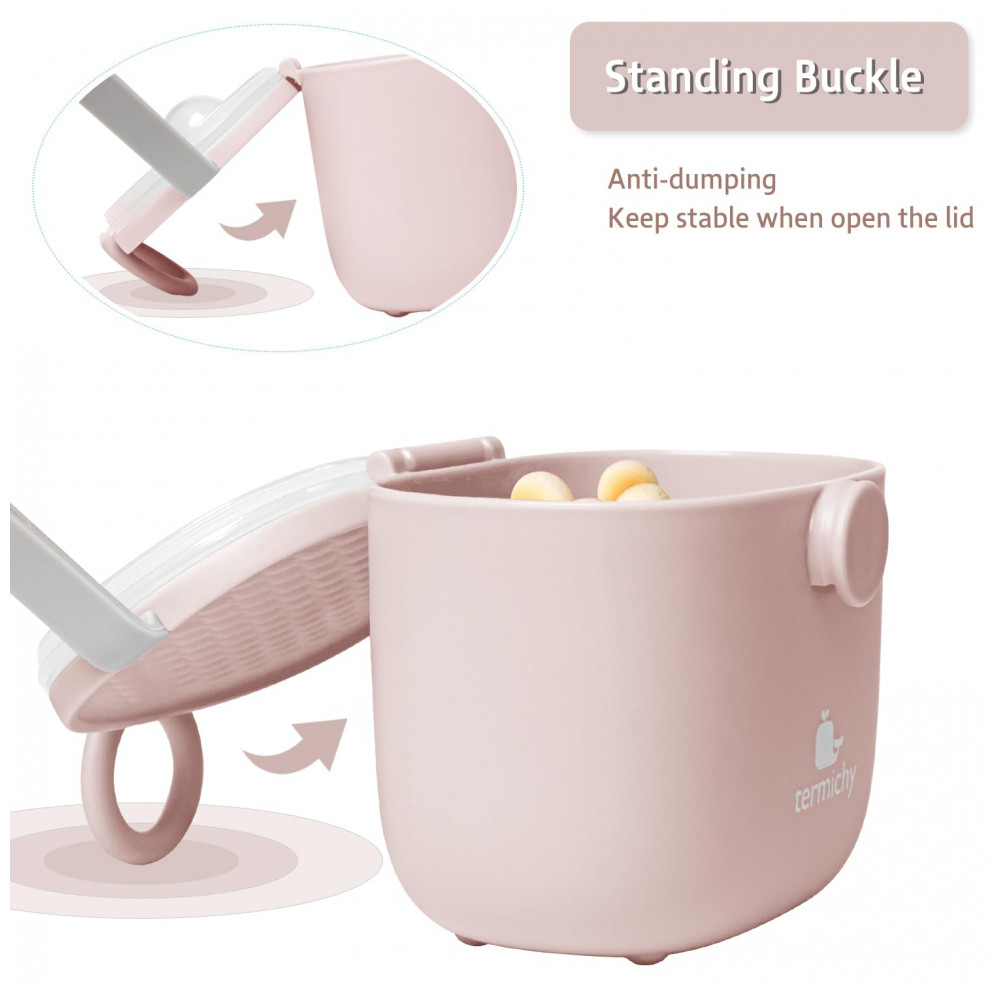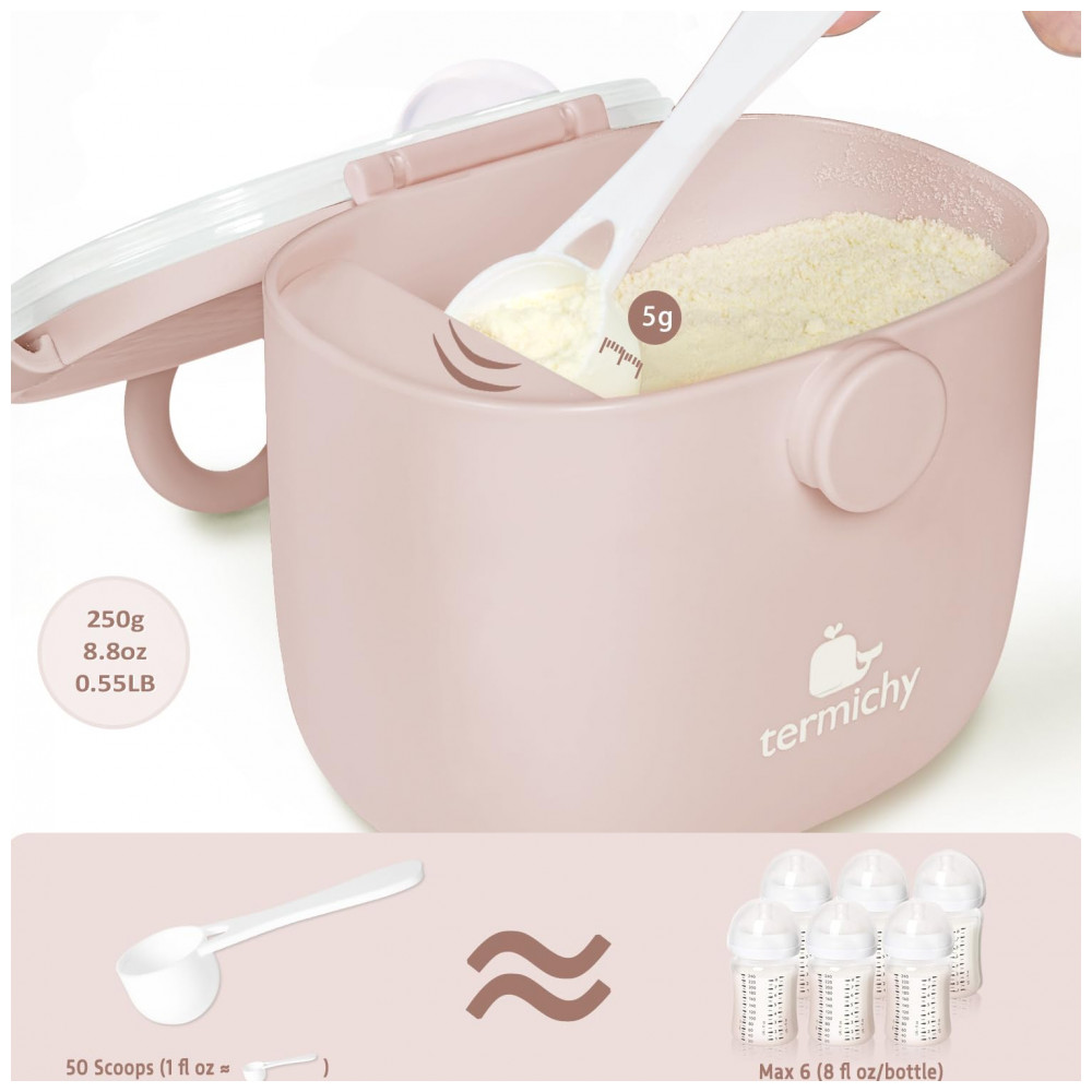 O Dispenser Fórmula Bebê Termichy é um recipiente portátil para armazenar e dosar leite em pó ou lanches para bebês durante viagens ou atividades ao ar livre. Fabricado em PP plástico grau alimentício sem BPA, lavável em lava-louças, possui capacidade de 250g ou 500ml, alça para transporte e design com compartimento separado para colher visando higiene.
