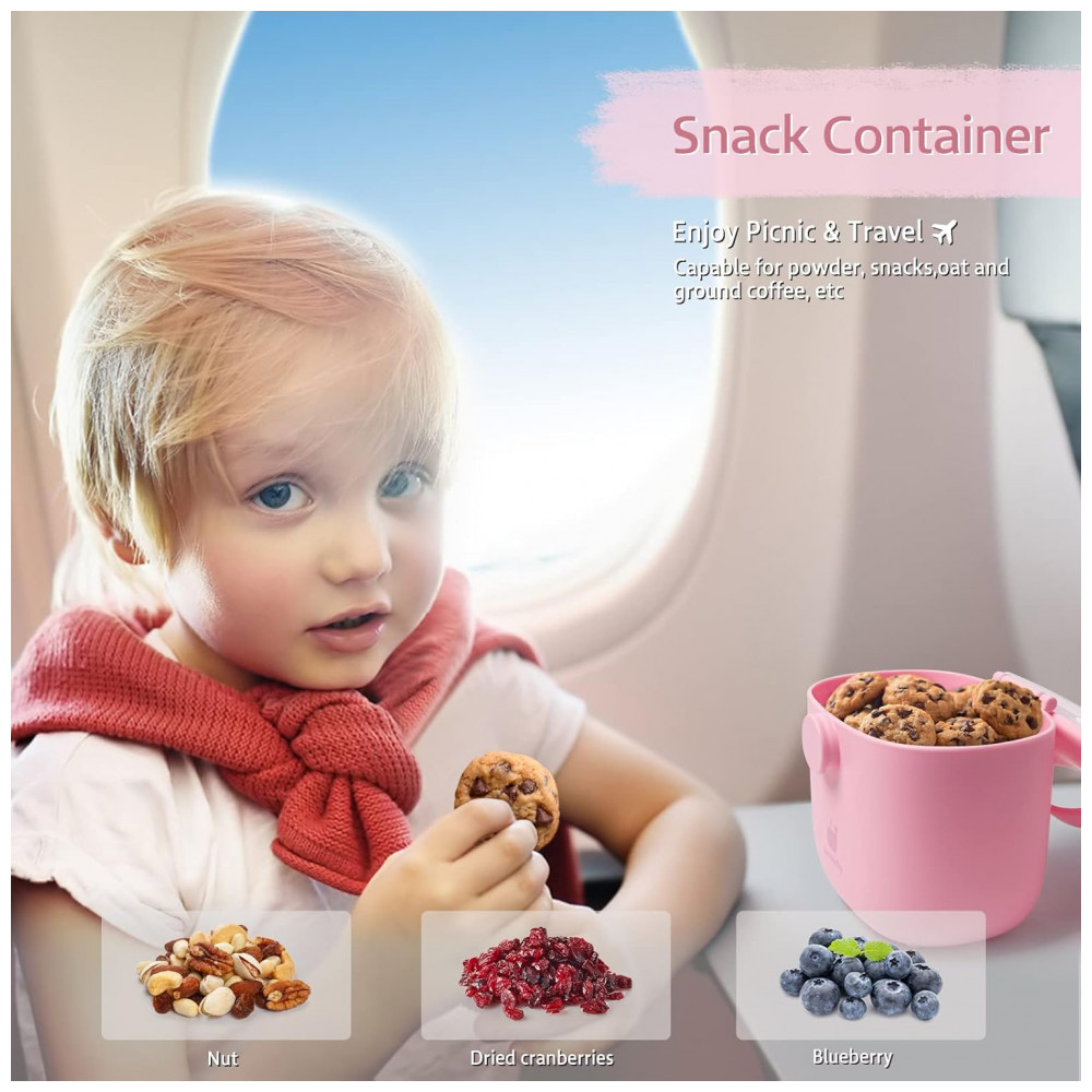 Indicado para bebês a partir de 0 anos, o dispenser acomoda lanches secos como biscoitos ou nozes. O formato cabe em bolsas e mãos adultas, compatível com usos em deslocamentos com bebês.