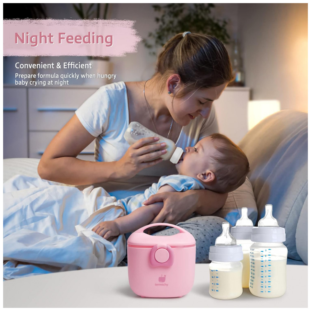 O Dispenser Fórmula Bebê Termichy é um recipiente portátil para armazenar e dosar leite em pó ou lanches para bebês durante viagens ou atividades ao ar livre. Fabricado em PP plástico grau alimentício sem BPA, lavável em lava-louças, possui capacidade de 250g ou 500ml, alça para transporte e design com compartimento separado para colher visando higiene.