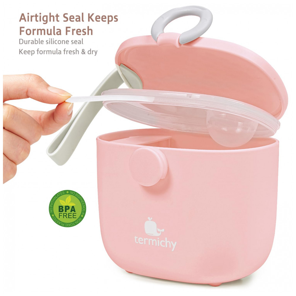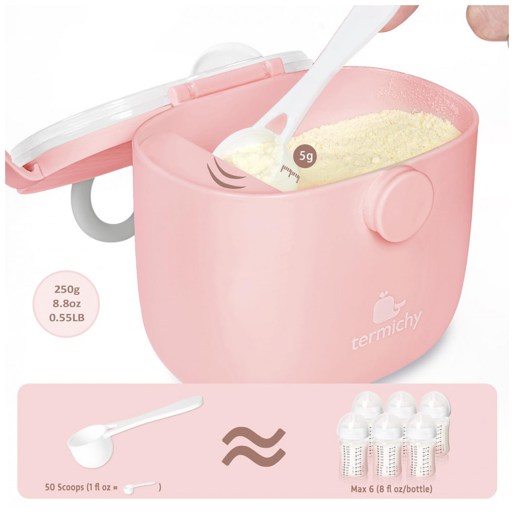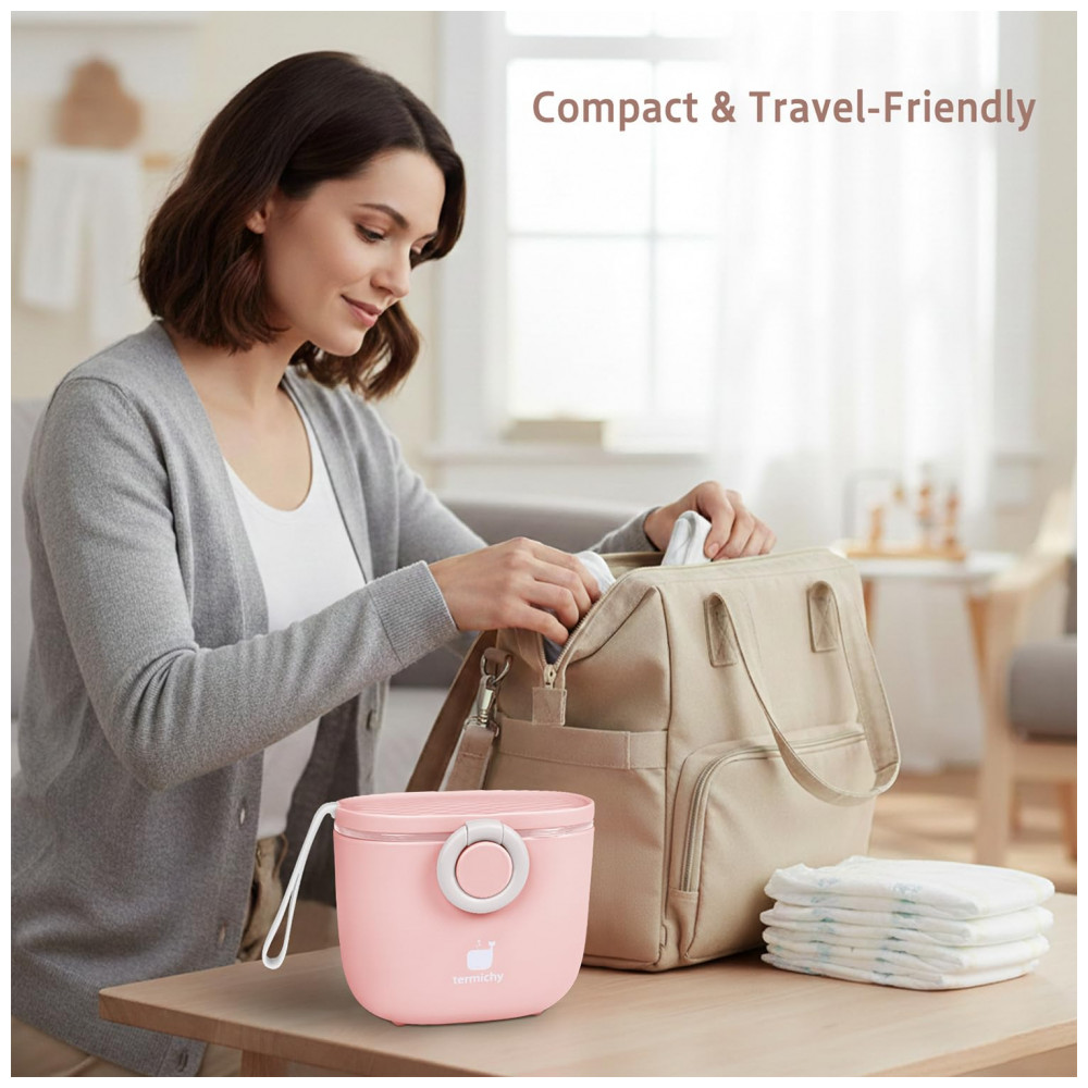O Dispenser Fórmula Bebê Termichy é um recipiente portátil para armazenar e dosar leite em pó ou lanches para bebês durante viagens ou atividades ao ar livre. Fabricado em PP plástico grau alimentício sem BPA, lavável em lava-louças, possui capacidade de 250g ou 500ml, alça para transporte e design com compartimento separado para colher visando higiene.