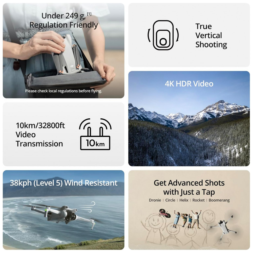 DJI Mini 3: Drone com Câmera 4K para Adultos 38min de Voo Transmissão de Vídeo de 10km Filmagem Vertical Real Retorno Automático por GPS Integrado