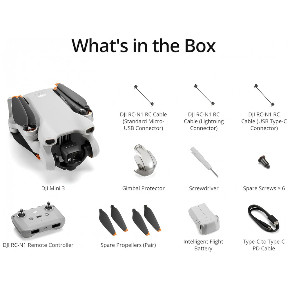 Componentes Incluídos: DJI Mini 3 x1, DJI RC-N1 RC Cable (Conector Lightning) x1, DJI RC-N1 RC Cable (Conector Micro-USB Padrão) x1, DJI RC-N1 RC Cable (Conector USB Tipo-C) x1, Protetor de Gimbal, Bateria de Voo Inteligente x1, Hélice, Controle Remoto, Parafuso, Chave de Fenda, Cabo Tipo-C para Tipo-C PD x1 Ver mais,