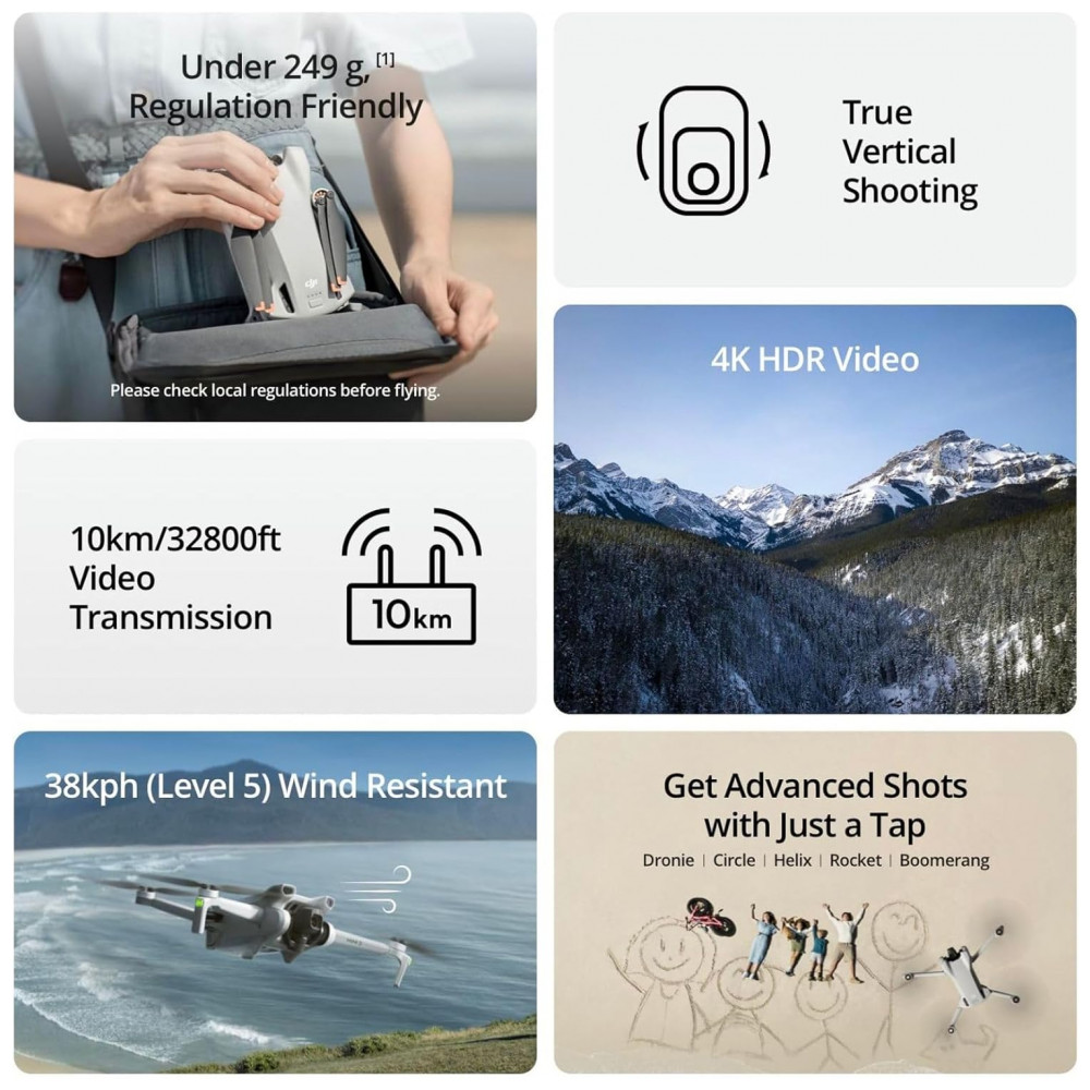 O DJI Mini 3 precisa ser ativado no App DJI Fly. Compatibilidade da plataforma pode ter removido o app DJI Fly do Google Play. Para uma melhor experiência de uso, acesse o site oficial da DJI para baixar o app DJI Fly. Verifique e siga rigorosamente as leis locais antes de voar. Capture imagens incríveis em 4K HDR, voe por até 51 minutos com a bateria inteligente (vendida separadamente) e desfrute de vídeos verticais impressionantes. Com transmissão de vídeo HD de até 10 km, é resistente ao vento, possui gimbal de 3 eixos e pode voar até 4.000 metros de altitude. Fácil de usar, seguro para iniciantes, com recursos criativos para imagens avançadas. Inclui baterias extras, hub de carregamento, bolsa de ombro e DJI RC com display HD de 5.5 polegadas embutido.