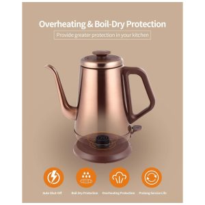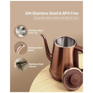 Interior em aço inoxidável 304 de grau alimentício A chaleira elétrica é construída em um corpo de aço inoxidável 304 com um bico de ganso, alças sem BPA e tampa de vapor, que mantém a água pura e segura para sua família. A chaleira elétrica pescoço de ganso de aço inoxidável 304 oferece uma grande vida útil, durabilidade notável e isolamento perfeito. Alça ergonômica Cool Touch da cafeteira para servir café que oferece uma pegada firme e confortável ao servir.