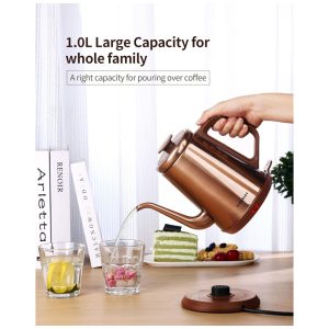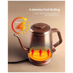 Ebulição rápida 1000W DmofwHi chaleira elétrica gooseneck tem potência ultra de 1000 watts para melhorar a eficiência da água fervente. A chaleira elétrica pode ferver 1,0 L , 34 onças de água em cerca de 5 minutos, economizando seu tempo para preparar café, chá e bebidas instantâneas. A chaleira elétrica com capacidade moderada de 1,0L para atender as necessidades diárias de toda a sua família.