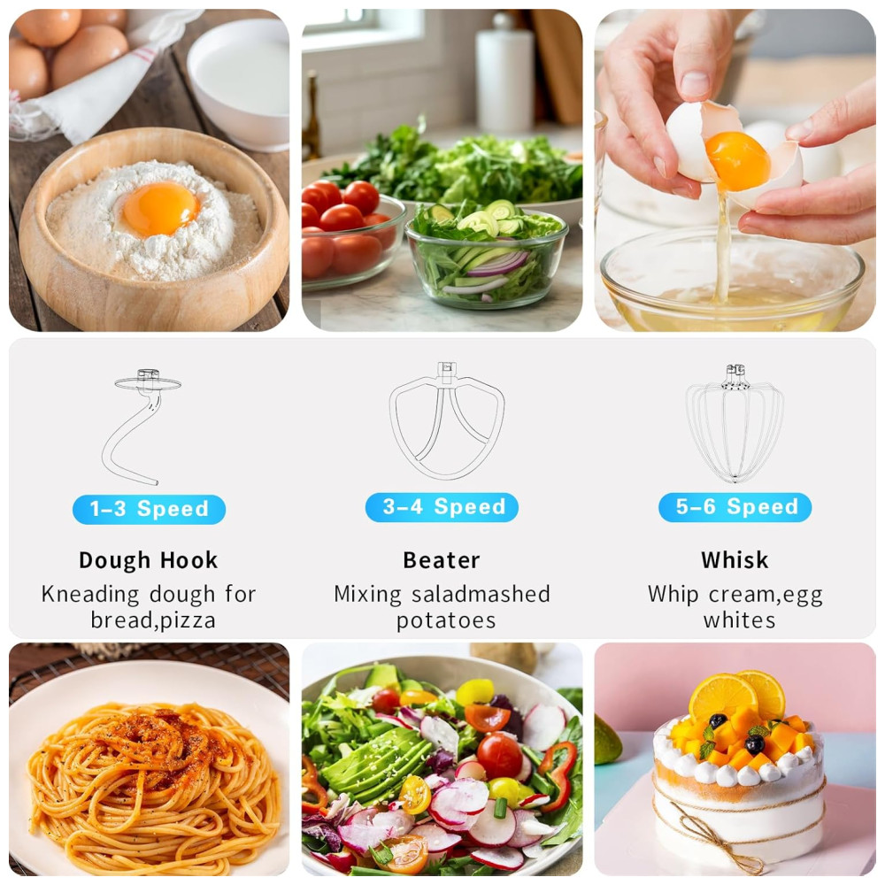 Batedeira Elétrica para Cozinha com Acessório A batedeira inclui batedeira de aço inoxidável, batedeira de alumínio, batedeira e proteção contra respingos que são fixados no eixo, aumentando a versatilidade da batedeira