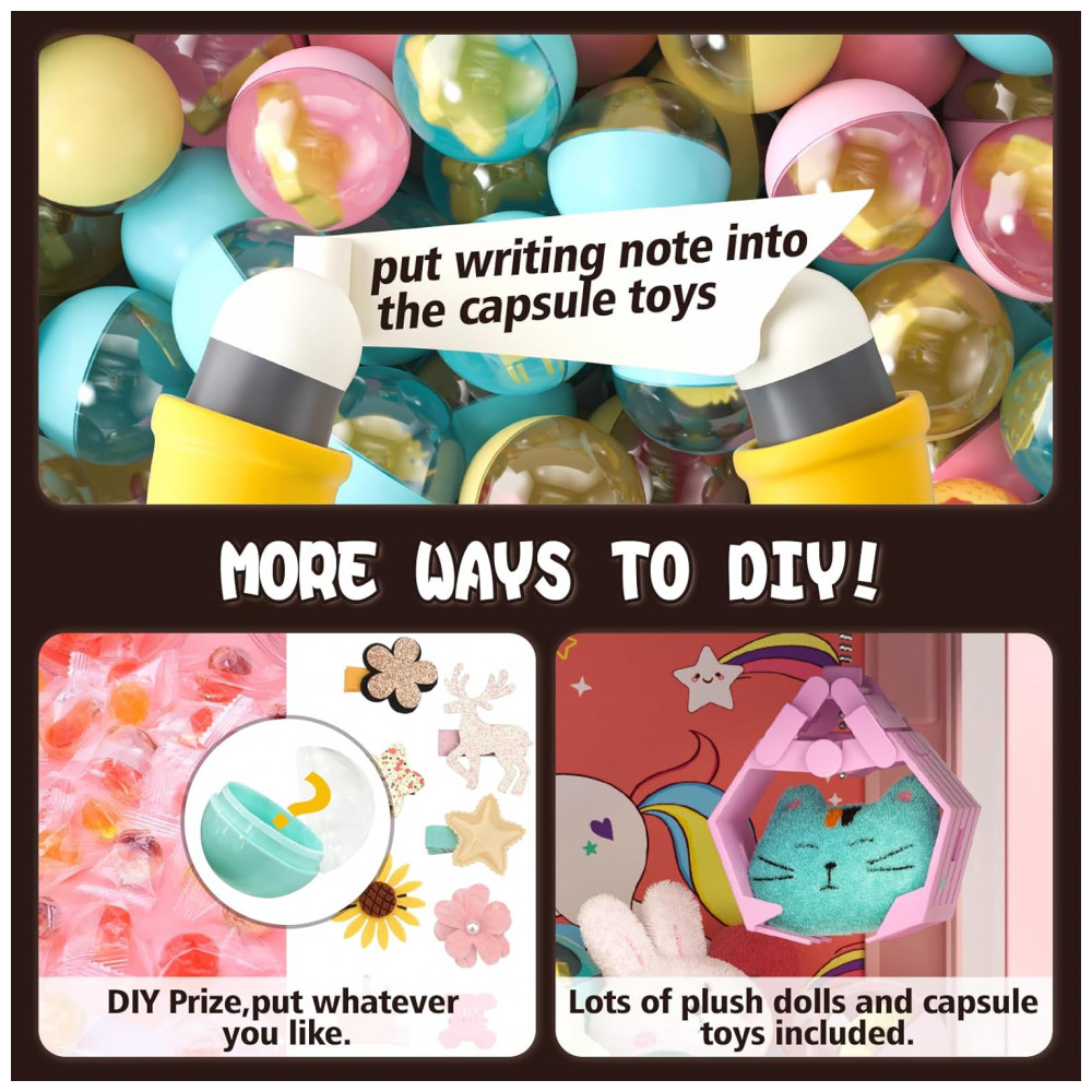 Itens inclusos: Máquina de garra, 6 pelúcias aleatórias, 10 ovos surpresa, adesivos decorativos, manual de instruções