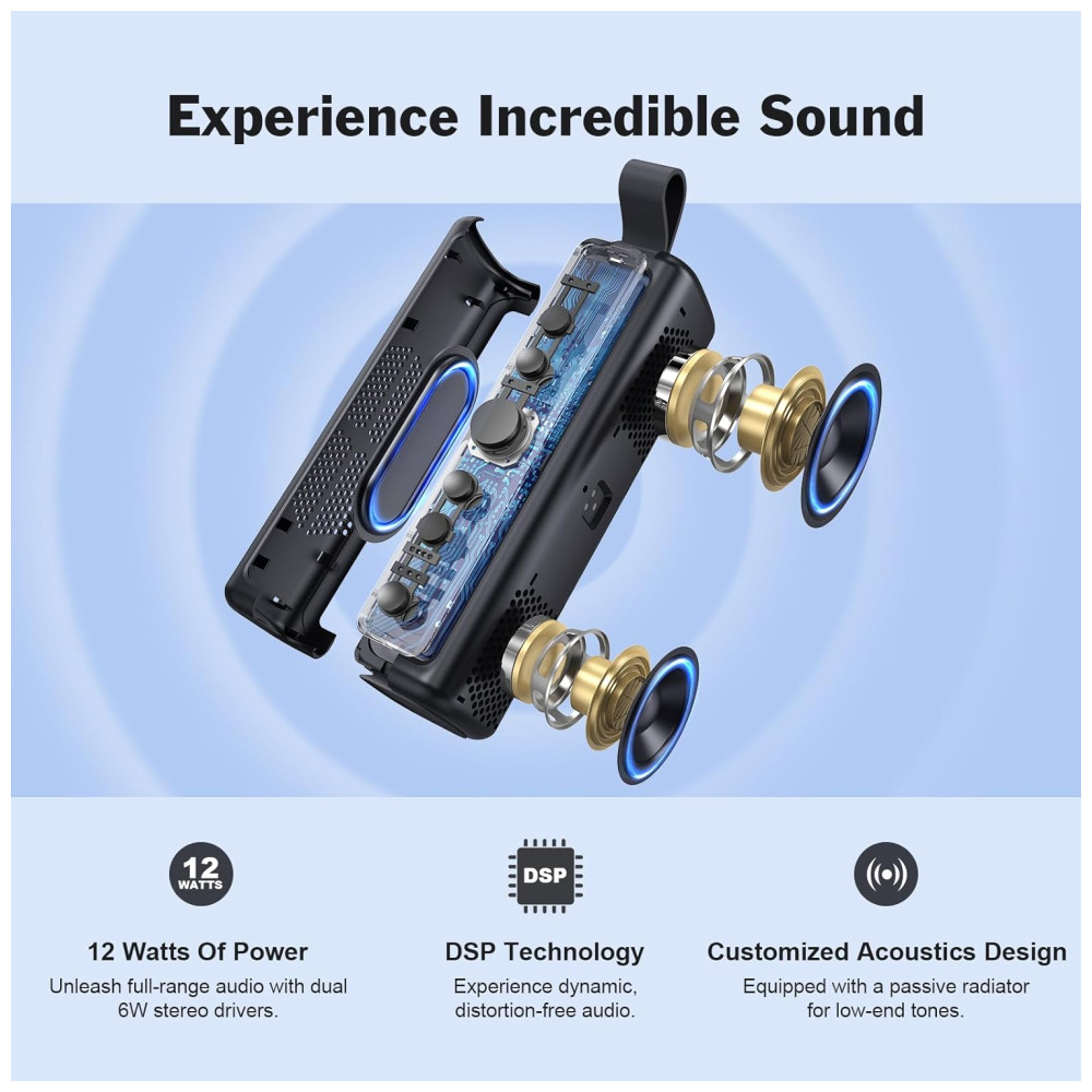 Som incrível alimentado por drivers estéreo 2X6W e um radiador passivo, o alto falante Bluetooth sem fio DOSS E go II oferece um som incrível com graves aprimorados, médios estreitos e agudos cristalinos sem distorção em qualquer volume. Além disso, o alto falante vem com um microfone embutido.