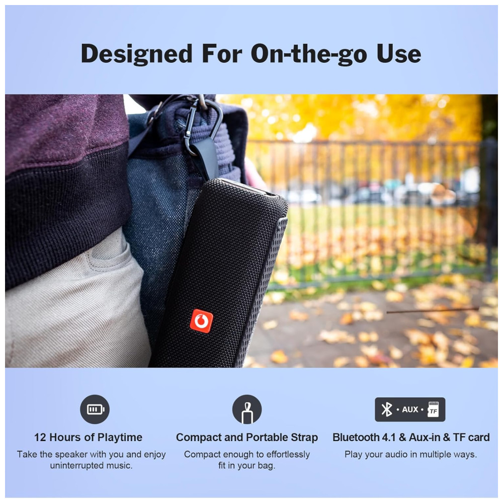 Compacto e portátil tamanho pequeno e design leve com uma alça, este alto falante portátil pode ser carregado na mão, preso à bolsa ou até mesmo à bicicleta. De churrascos no quintal à festa de fim de semana na praia, leve suas trilhas sonoras para onde quiser