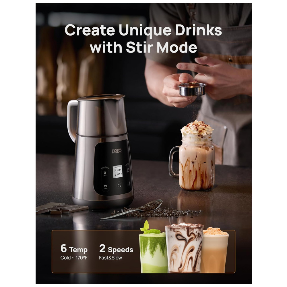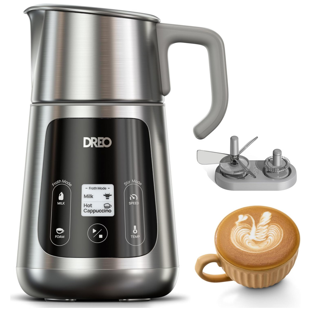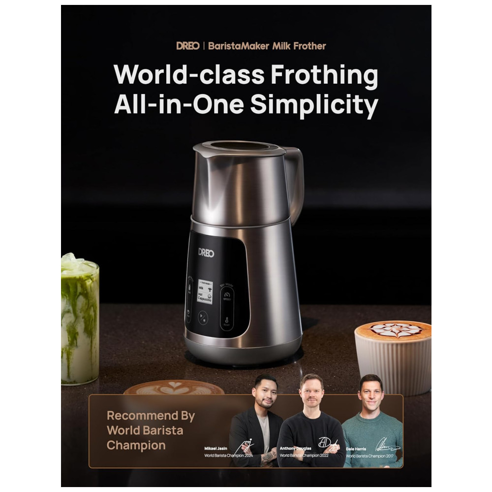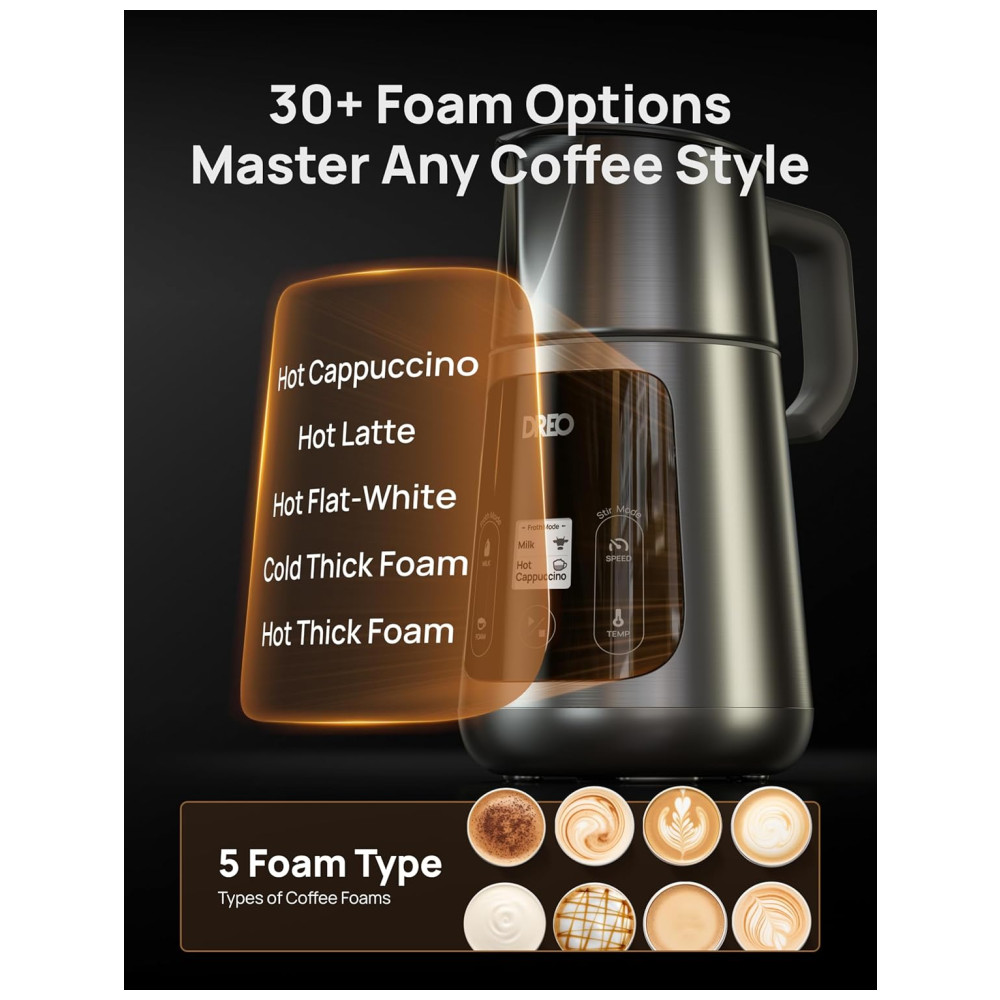 Dreo BaristaMaker Espumador de leite: 30 Bebidas Espuma Perfeita Design Elegante em Prata Leite de Origem Animal e Vegetal 450ml