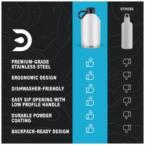 VEDAÇÃO À PROVA DE VAZAMENTO A tampa de torção isolada à prova de vazamentos mantém a carbonatação temperatura, evitando que qualquer derramamento vaze em sua mochila ou carro.