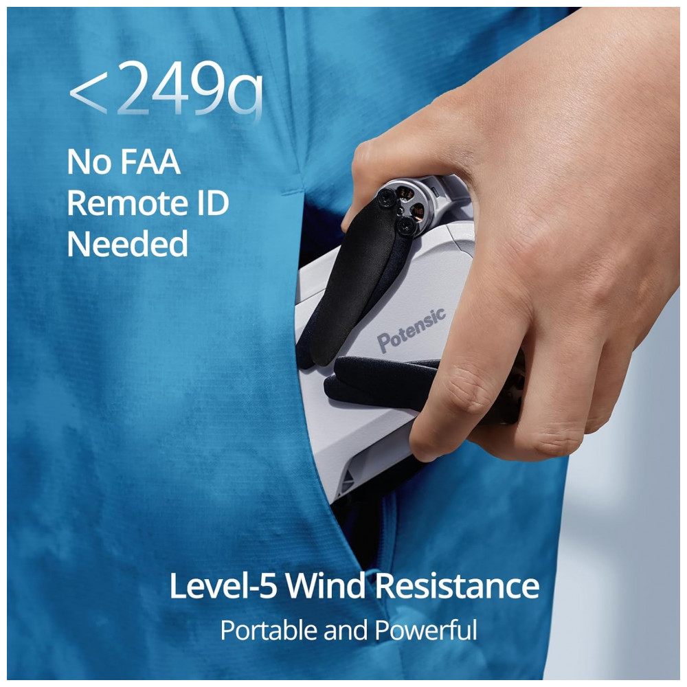 Pick Up and Go O mini drone Potensic ATOM SE pesa menos de 250 gramas 8,8 oz , 0,55 lbs , nos Estados Unidos e no Canadá, você pode pilotar os mini drones de câmera ATOM SE sem registro. E também suporta captura de vídeo com resolução 4K em fotos de 30fps e 12MP e fornece até 62 minutos de tempo de vôo com 2 baterias inteligentes. O design dobrável é pequeno o suficiente para caber no bolso da jaqueta, tornando o ideal para qualquer passeio.