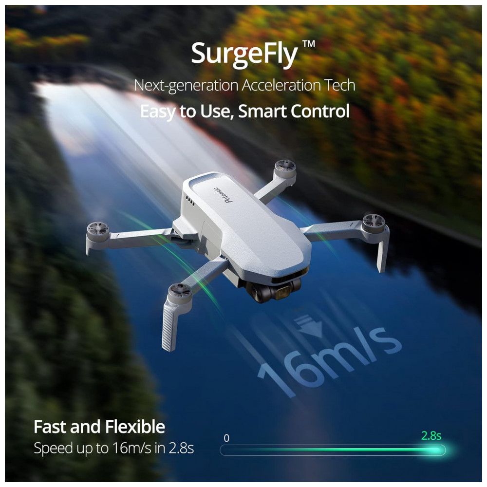 Controle inteligente SurgeFly O sistema de controle de vôo SurgeFly fornece aos pilotos uma experiência confiável de controle de vôo. Existem três modos de vôo Vídeo, Normal e Esporte permitindo que você desafie suas habilidades à medida que se torna um piloto melhor. No modo Esporte, a velocidade máxima pode ser de até 16m , s em 2,8s. O SurgeFly fornece navegação otimizada para o drone, combinada com o sensor ToF para ajudar a obter posicionamento de alta precisão e controle mais estável ao voar dentro de casa ou em ambientes com GPS.