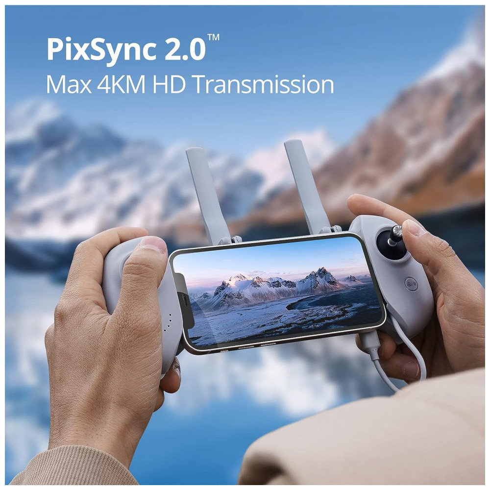 Faixa de transmissão de 4 km , 13.123 pés com PixSync 2.0 a faixa de controle é de até 4 km , 13.123 pés, a tecnologia PixSync 2.0 garante estabilidade, vídeo consistente na maioria das condições de gravação e permite baixa latência para vídeo digital HD. Com a ajuda do sistema de controle de vôo SurgeFly atualizado e da tecnologia ShakeVanish, os pilotos de drones terão uma ótima experiência de vôo e poderão tornar cada tiro aéreo suave e constante.