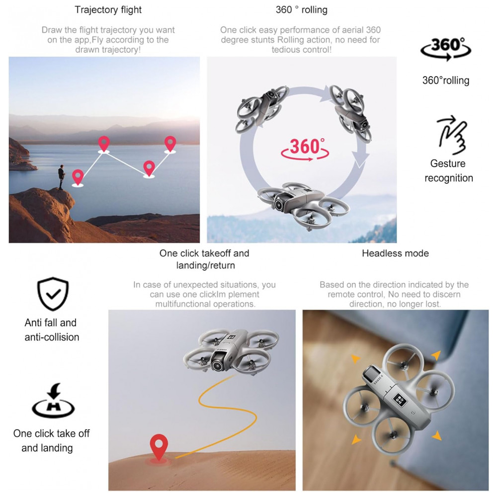 A câmera HD 1080P deste drone possui uma câmera dupla ajustável eletricamente em 180°, proporcionando um campo de visão mais amplo, câmera WiFi HD 1080P e transmissão FPV, permitindo que você veja o mundo do ponto de vista de um pássaro. Conectando seu telefone ao WiFi do drone, você pode assistir a paisagem maravilhosa em tempo real. Fotos ou vídeos são salvos automaticamente no álbum do seu telefone, que você pode facilmente compartilhar nas redes sociais. Com diversas funcionalidades como frente/trás, virar para esquerda/direita, voo lateral, luzes de LED, modo de manutenção de altura, modo VR, retorno automático com um toque, looping 360°, voo por trajetória, suporte para filmagens em paisagem retrato/cabeça para cima, torna-o extremamente amigável para iniciantes e adequado para crianças. Essas funções proporcionarão a você uma experiência de voo divertida e emocionante. Compacto e portátil, o drone com câmera vem com uma bolsa de transporte portátil. Ele mede 14,0 x 11,3 x 4,7 cm, pesando menos de 315 gramas, podendo ser ainda mais leve que seu telefone, tornando-o fácil de transportar e o companheiro perfeito para atividades ao ar livre. O drone com câmera possui recursos fáceis de usar que facilitam o controle para crianças ou iniciantes. Basta pressionar o botão de decolagem/pouso de um toque para voar. Ele também vem com sistema de detecção de obstáculos de três lados e duas baterias, proporcionando até 20 minutos de tempo de voo. O sistema de hover e a tecnologia de posicionamento de fluxo óptico garantem um voo mais estável e controlável. Este drone pode voar ao longo de um caminho predefinido ou orbitar ao redor de um ponto. Este drone traz diversão para todos os lugares, seja em festas, na escola, pescaria, caminhadas, longas viagens, etc. É o presente perfeito para entusiastas de drones, exploradores curiosos, adultos e crianças que amam descobrir coisas novas! Acima de 12 anos.