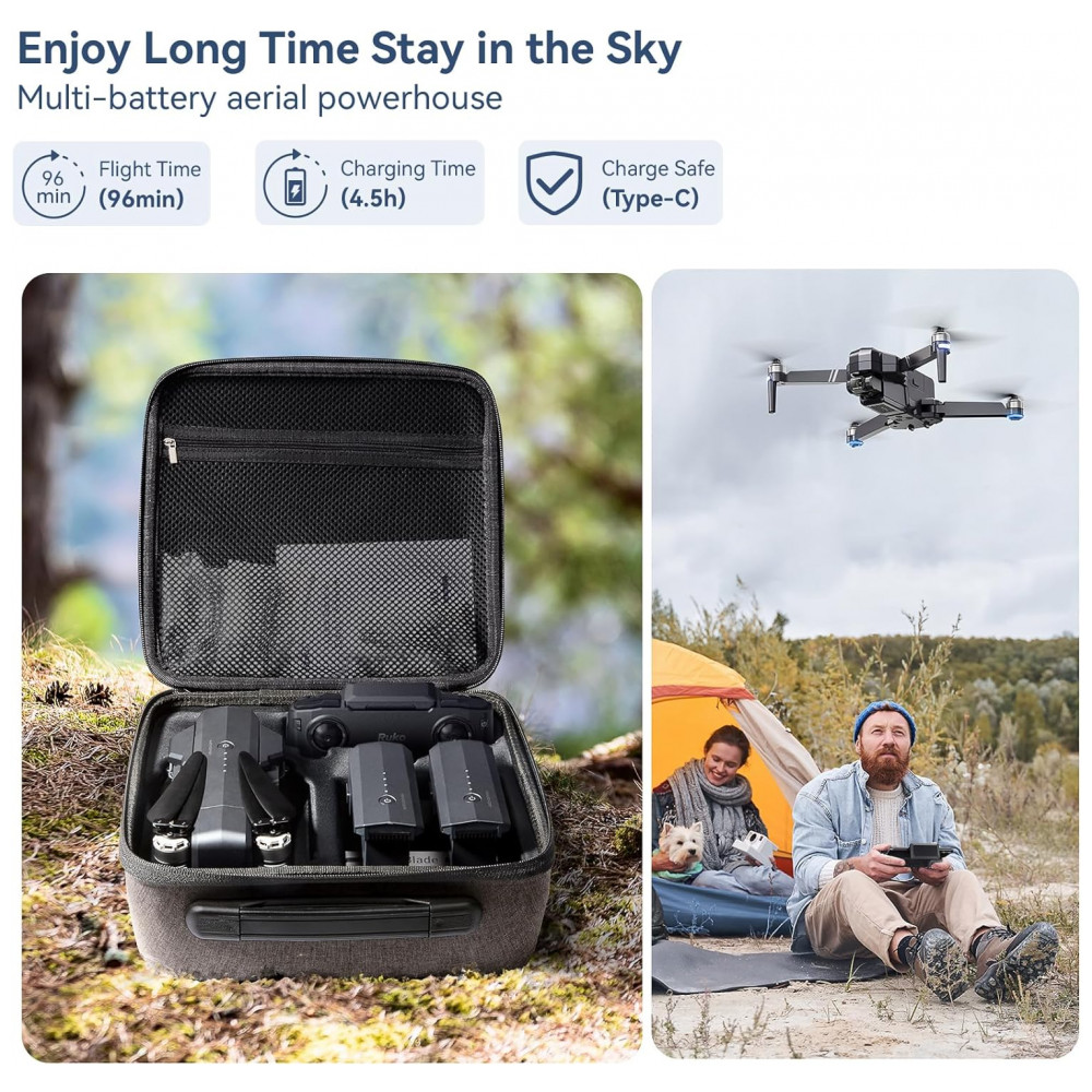 FÁCIL DE OPERAR O modo iniciante, decolagem , pouso com uma torneira ajuda você a experimentar rapidamente a diversão de voar, posar um gesto de paz pode tirar fotos, 3 km de distância de transmissão de vídeo ao vivo, não precisa se preocupar em parar de mostrar a tela do voo. Quando a distância do voo for excedida, o drone retornará automaticamente para casa.