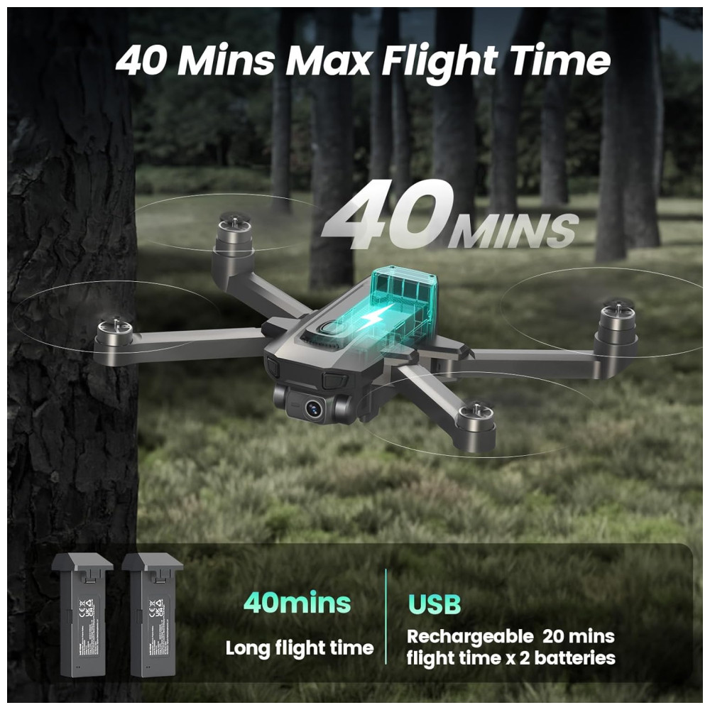 O drone também conta com funções de decolagem e pouso com um único botão, modo sem cabeça e troca de velocidade, facilitando o controle para iniciantes e crianças. Com duas baterias modulares recarregáveis, ele oferece até 40 minutos de voo (20 minutos por bateria), proporcionando uma experiência prolongada e divertida.