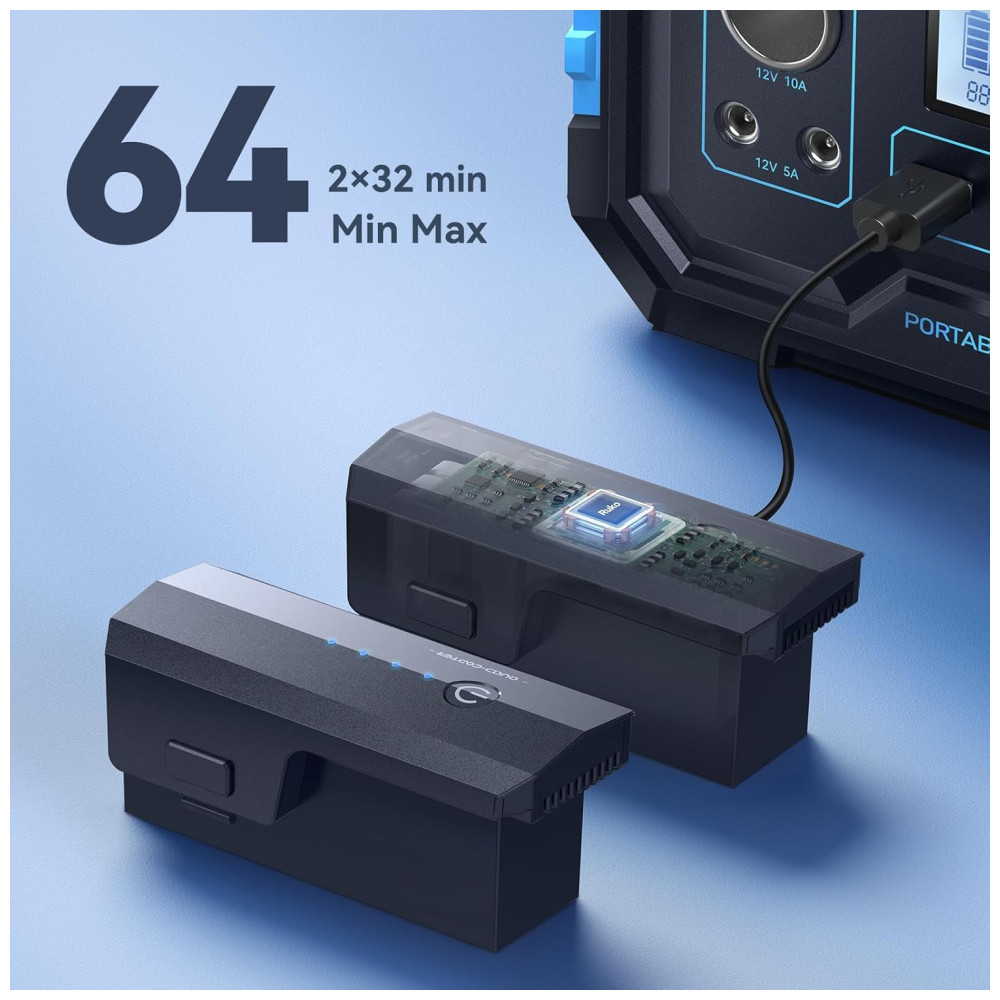 Tempo de voo de 56 minutos o drone vem com duas baterias, cada uma pode fornecer um tempo de voo de 28 minutos, a bateria é inteligente e segura, seu status de energia é monitorado e relatado em tempo real. Moeda de saída do carregador adaptável 5V, 3A