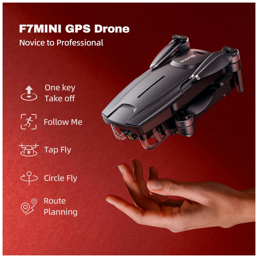 O drone F7MINI GPS também possui posicionamento GPS preciso e retornará automaticamente para casa quando a bateria estiver fraca ou o sinal for perdido, garantindo um retorno estável e seguro sem perder o drone. Ele tem um tempo de voo de até 60 minutos e pode ser equipado com mais baterias.