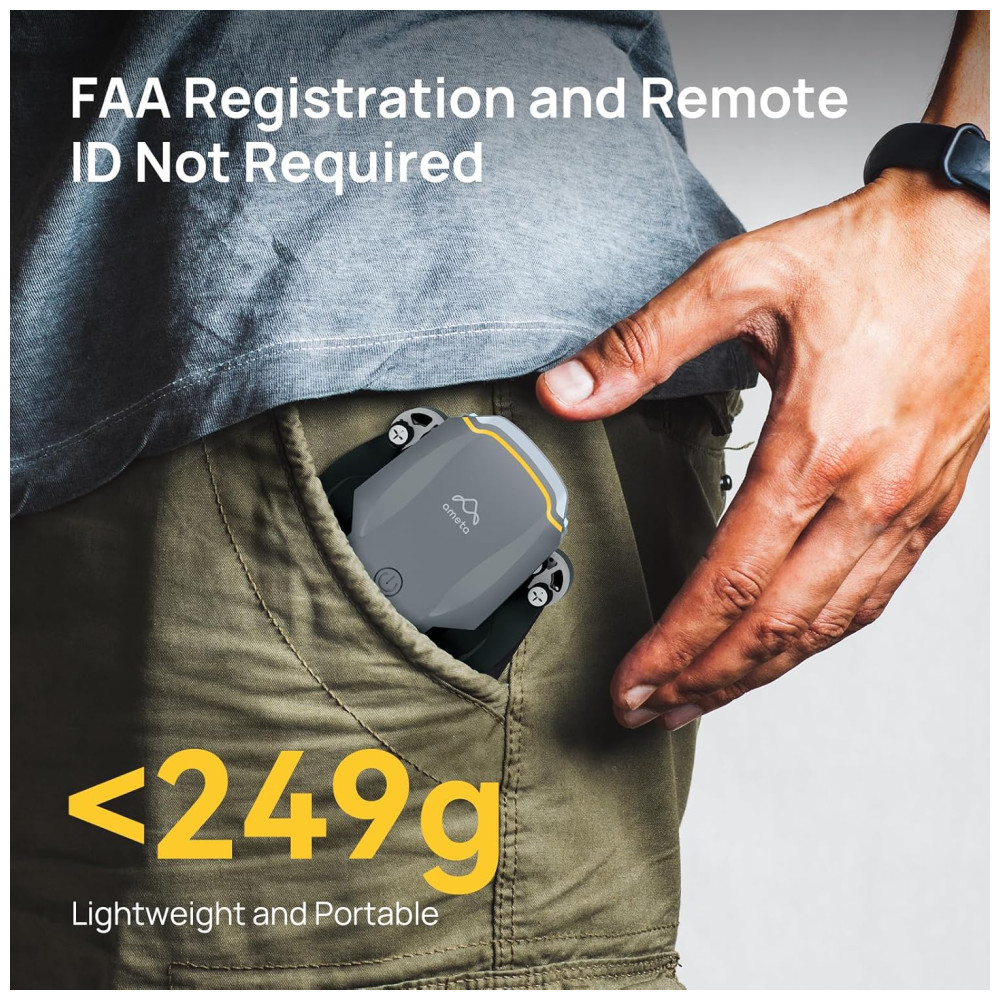 Pesando menos de 249g, o mini drone Ameta S20 Lite não requer registro FAA ou ID remoto na maioria dos países e regiões. Seu design elegante e dobrável facilita o transporte, cabendo facilmente no bolso da jaqueta. Além disso, vem com uma bolsa de transporte premium, pronto para acompanhá-lo em todas as suas aventuras.