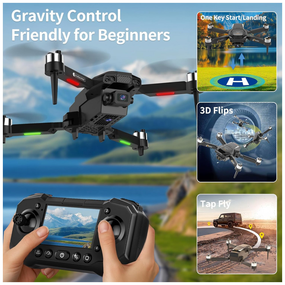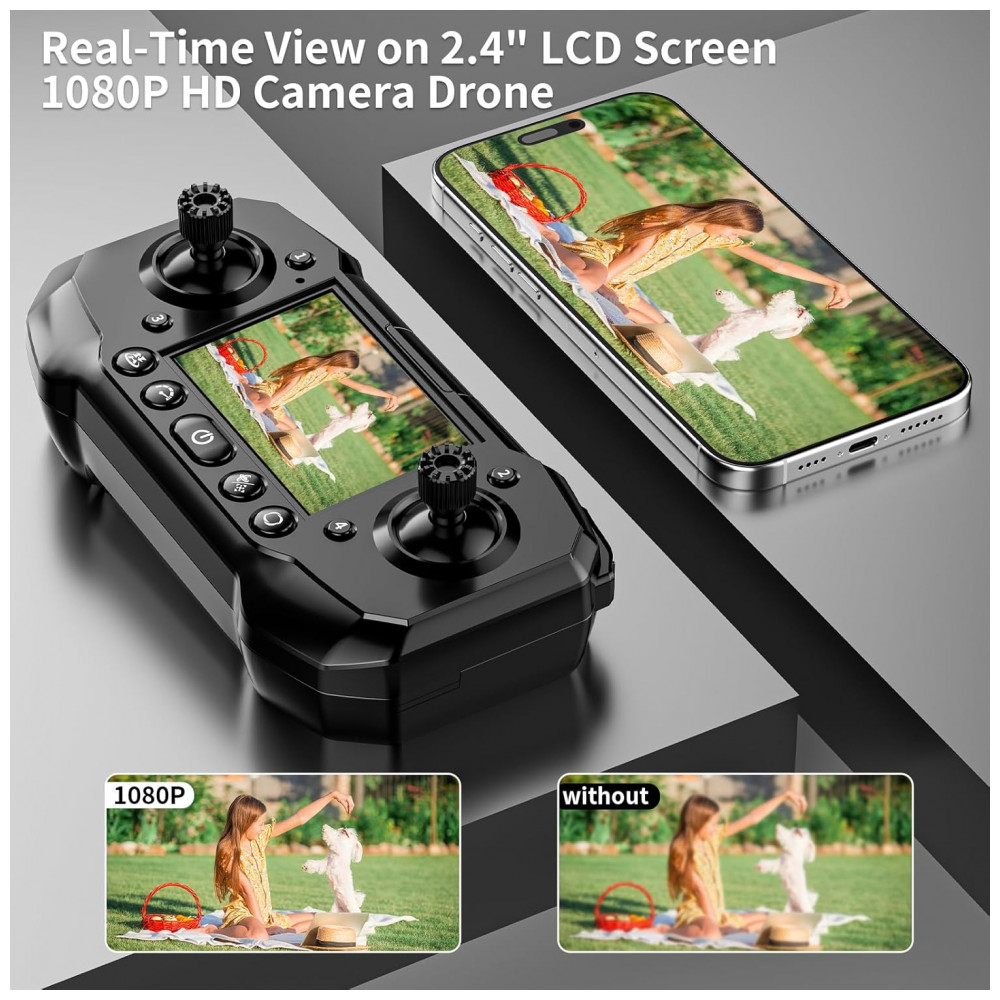 Explore o céu com o Drone com Tela LCD! Equipado com controle remoto e display LCD embutido de 2,4 polegadas, este drone de fotografia transmite em tempo real as imagens capturadas. A câmera de 1080P possui slot para cartão SD de 8GB, suportando até 32GB para armazenar suas fotos e vídeos. Este drone infantil apresenta diversas funções: posicionamento por fluxo óptico, voo estável, flips 3D, modo sem cabeça, decolagem/pouso com um toque, desvio de obstáculos, voo em trajetória e controle por gestos. Dobrável e leve, pesando menos de 0,7 kg, é ideal para iniciantes e crianças, fácil de operar e não requer registro FAA. Os 4 motores sem escova consomem menos energia, proporcionando estabilidade em voo e longa vida útil. Aproveite uma experiência de voo segura com 16 minutos de autonomia.