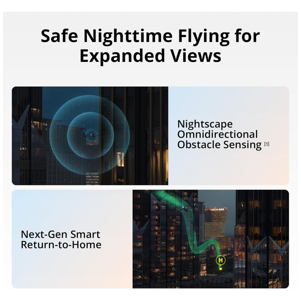 Características Especiais: Modos de Cor 10-Bit D-Log M e HLG, Evitação Omnidirecional de Obstáculos Dia e Noite, Sensor LiDAR de Frente, Múltiplos Modos de Voo Pré-Programados, Até 45 Minutos de Tempo de Voo