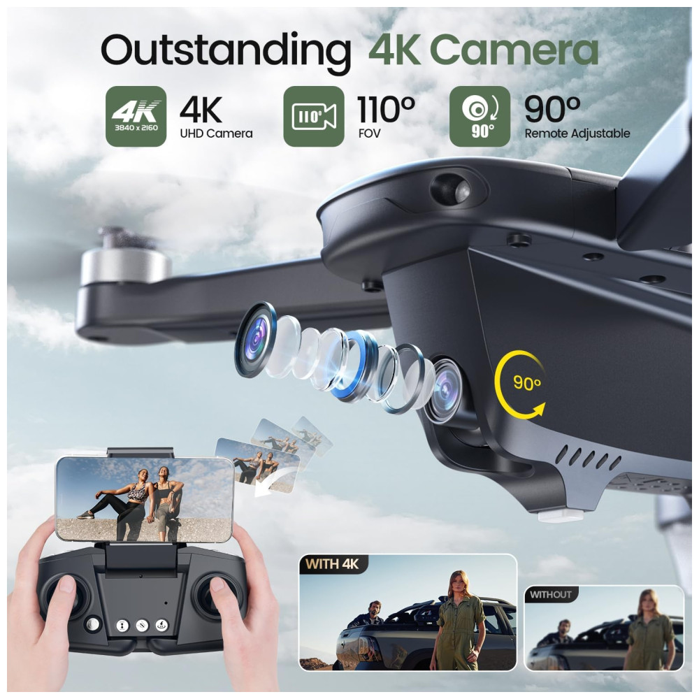 Câmera 4K Ultra Clear câmera 4K com grande angular de 110 e 90 ajustável fornece uma imagem de alta resolução, permite capturar uma foto perfeita A transmissão FPV de 5 GHz oferece vídeos suaves e estáveis, mesmo em condições de alta velocidade ou vento forte
